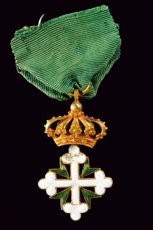 1780 circa Croce da ufficiale. In oro con smalti (mancanze), piatta. Con larga corona traforata e con nastro originale. Molto rara.