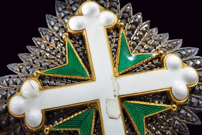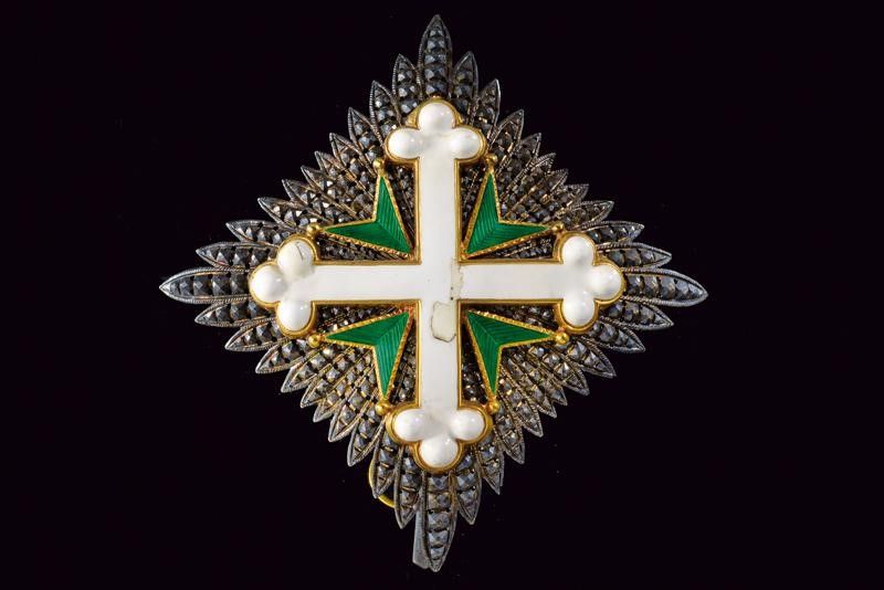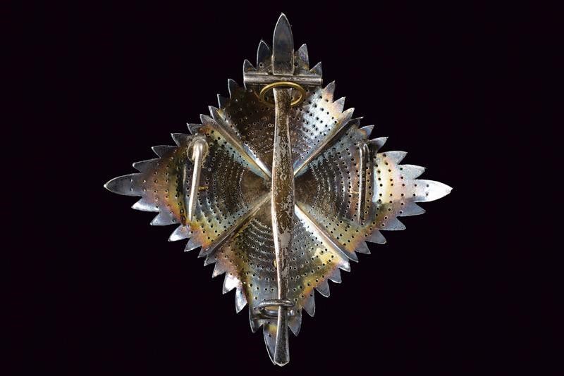 Regno di Sardegna, dimensioni 8.2 x 8.3 cm. Secondo quarto del XIX Secolo Placca da commendatore, di finissima fattura, riccamente brillantata e traforata, Il centro in oro e smalti (due chip restaurati). Sul retro spilla verticale con punzone e due ganci.