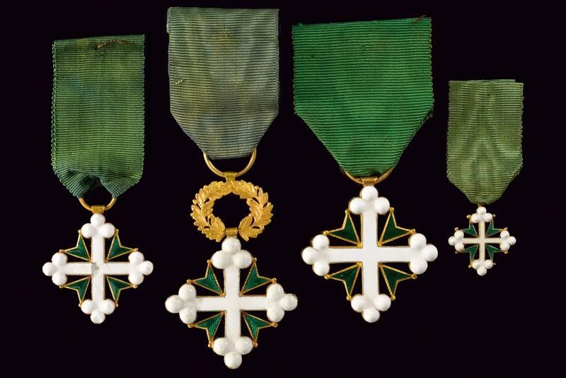 Regno di Sardegna, altezza 1.9 - 2.9 - 3.6 - 5.1 cm. Metà del XIX Secolo Gruppo di quattro decorazioni appartenute al Generale Vittorio Amedeo Colli Ricci di Felizzano (1787 - 1856). Si tratta di tre croci di cavaliere in oro e smalti di varie grandezze, tutte con nastro. La quarta decorazione raffigura la croce da ufficiale s