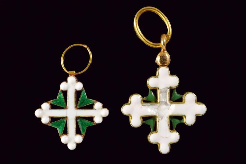 Fine del XIX Secolo Due croci da cavaliere in miniatura. In oro e smalti. La croce più piccola con una minuscola mancanza. Quella più grande con vari chip, l'anello con punzone.