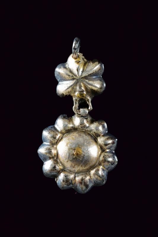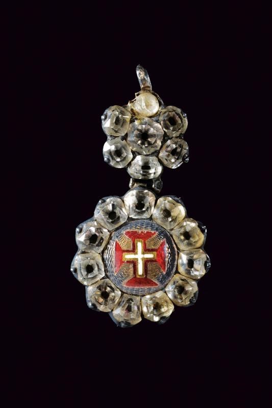 XIX Secolo In argento, con medaglione smaltato e croce in oro; decorato, come l'aggraffa, con simil-diamanti. Anellino di sospensione.