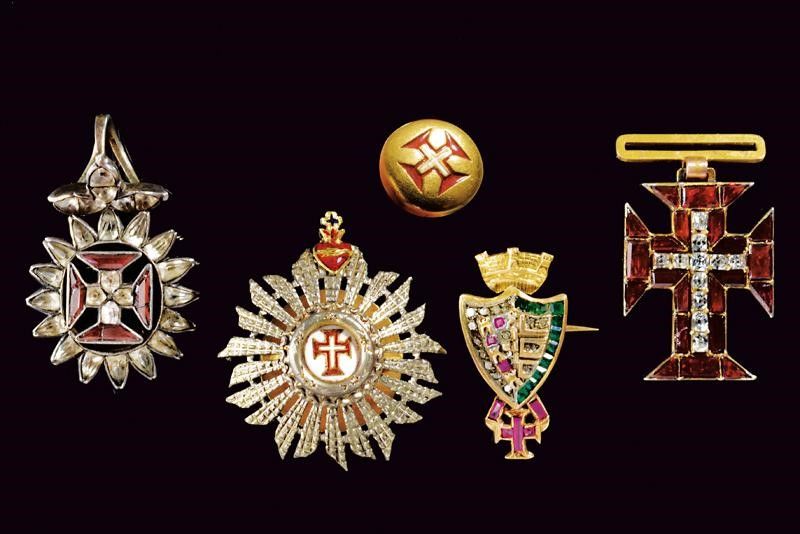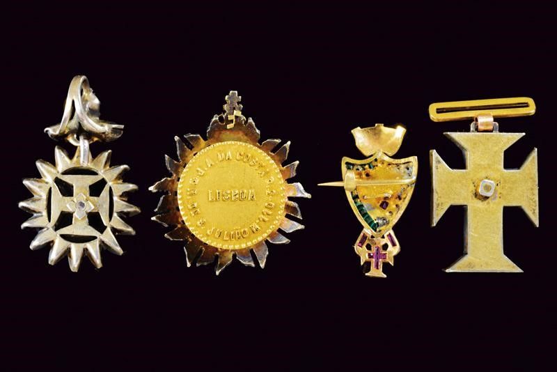 Portogallo, altezza 2.2 - 2.5 - 2.8 - 3 cm. XIX Secolo Lotto di miniature. Croce dell'Ordine in simil-pietre rosse e bianche, una spilla con simil-pietre rosse e bianche, una placca in argento traforato e parzialmente smaltato da asola, con marcatura sul retro del gioielliere Costa di Lisbona. Una spilla con