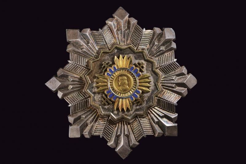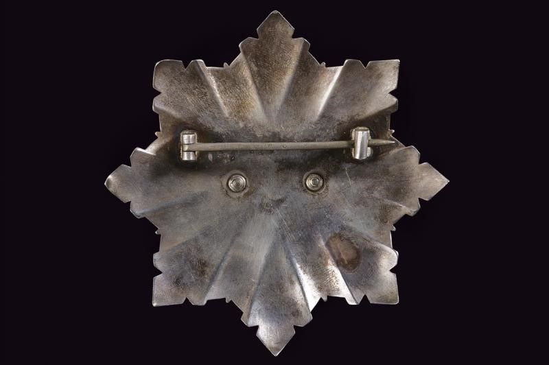 1939-45 Placca di Gran Croce, in argento, con medaglione dorato e smaltato al centro. Sul retro spilla verticale marcata '987' (per l'argento) e con un altro punzone. Molto rara.