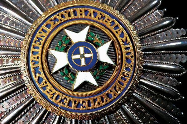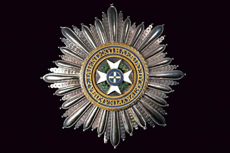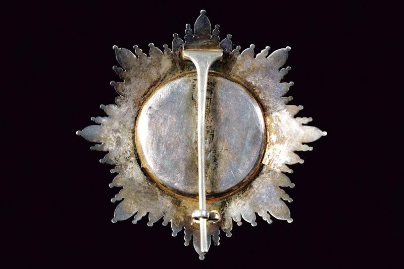 Grecia, diametro 8.1 cm. 1840 circa Primo modello, 1833 - 1862. Placca di Gran Croce in argento, il centro con croce in oro smaltato nei colori della Baviera (sottili crepe appena visibili). Fattura straordinaria, con iscrizioni intorno alla croce in oro traforato, in bassorilievo e su anel