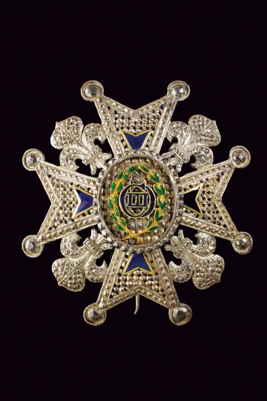 Fine XIX inizio XX Secolo Placca da commendatore, in argento brillantato e traforato, parzialmente smaltato. Sul retro spilla verticale tra due ganci.