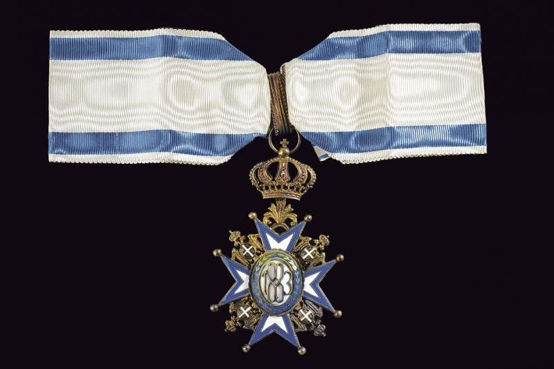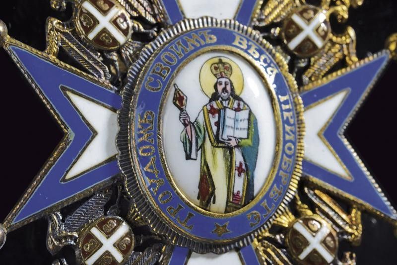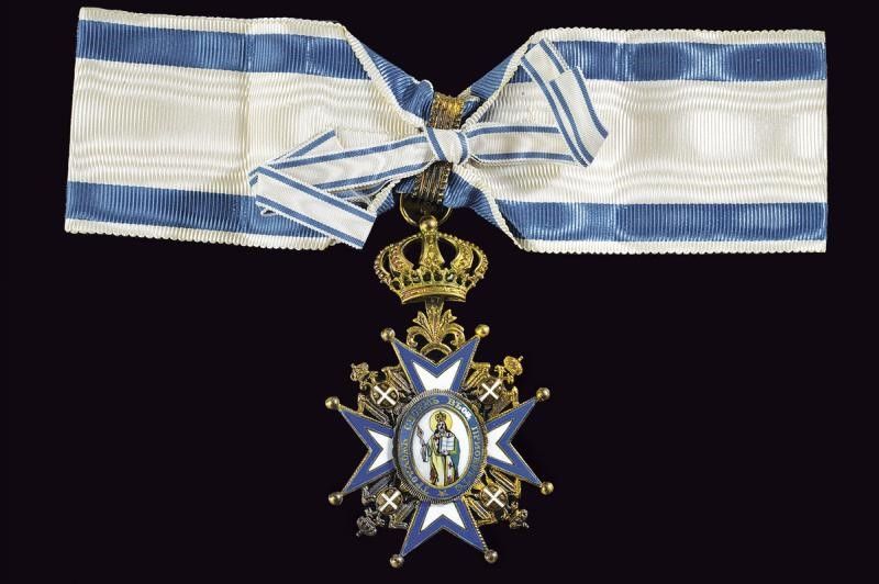 inizio del XX Sec. Croce da commendatore, in metallo smaltato. Il santo con veste verde. Completa di nastro da collo.