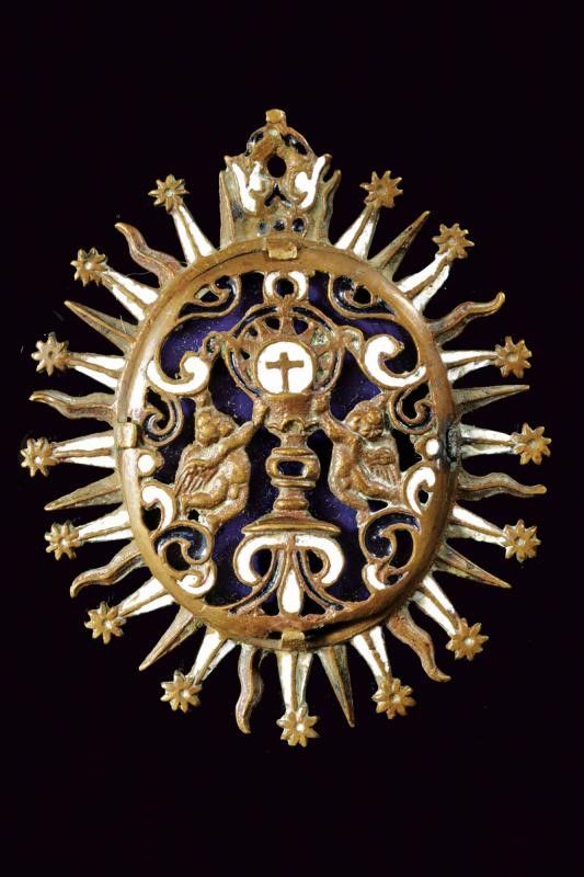 Italia, dimensioni 6.7 x 8 cm. XIX Secolo Al recto miniatura con dipinto effigiante una figura muliebre soprastante un'iscrizione scarsamente leggibile. In una cornice d'ottone con raggi e stelle smaltati color bianco e nero. Il retro smaltato e traforato con angeli che sorreggono una croce. Picc