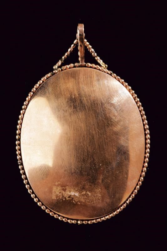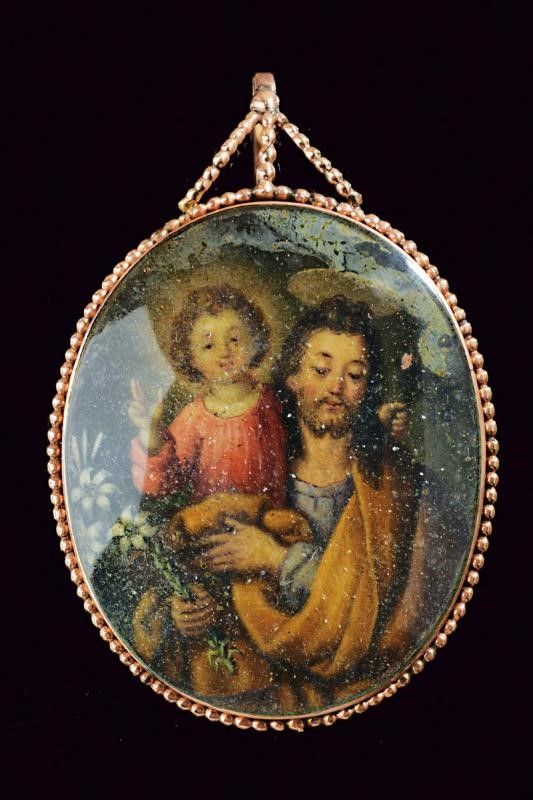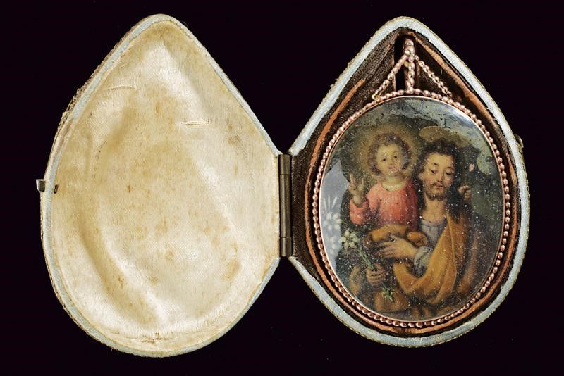 Italia, dimensioni 5 x 6 cm. XIX Secolo Miniatura di forma ovale, recante effige dipinta in policromia di San Giuseppe con il Bambino Gesù e la Verga Fiorita. Sotto vetro e in cornice perlinata in metallo dorato. In astuccio originale in legno rivestito con resti di velluto celeste (molto liso
