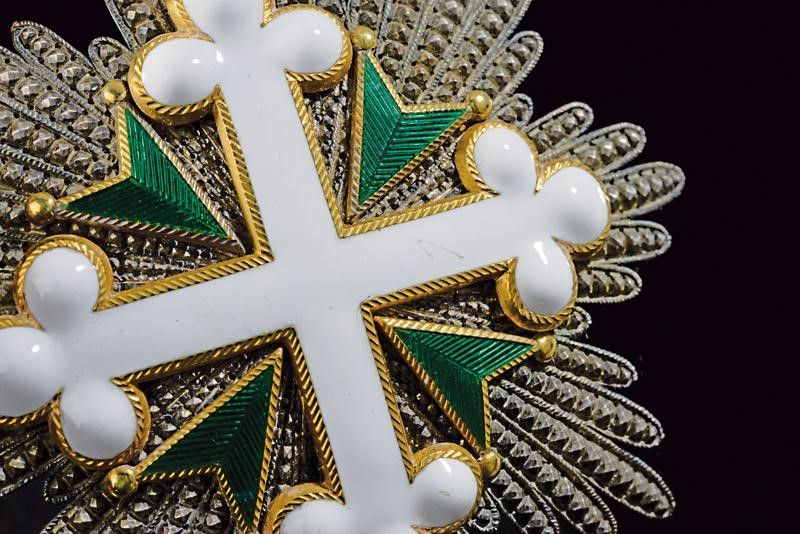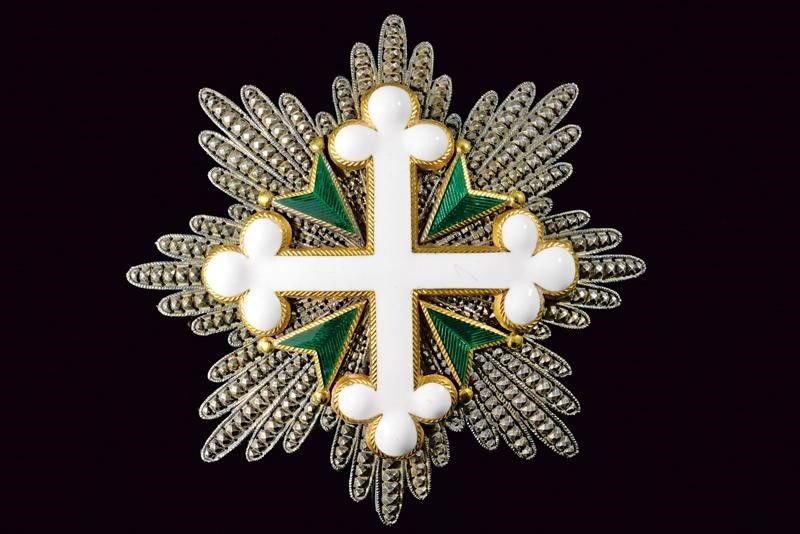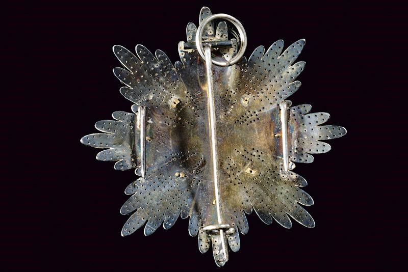 XIX Secolo Placca di Gran Croce dell'ordine dei Santi Maurizio e Lazzaro, in argento brillantato e traforato, la croce in oro e smalti. Il retro con spilla verticale, ai lati due graffette.