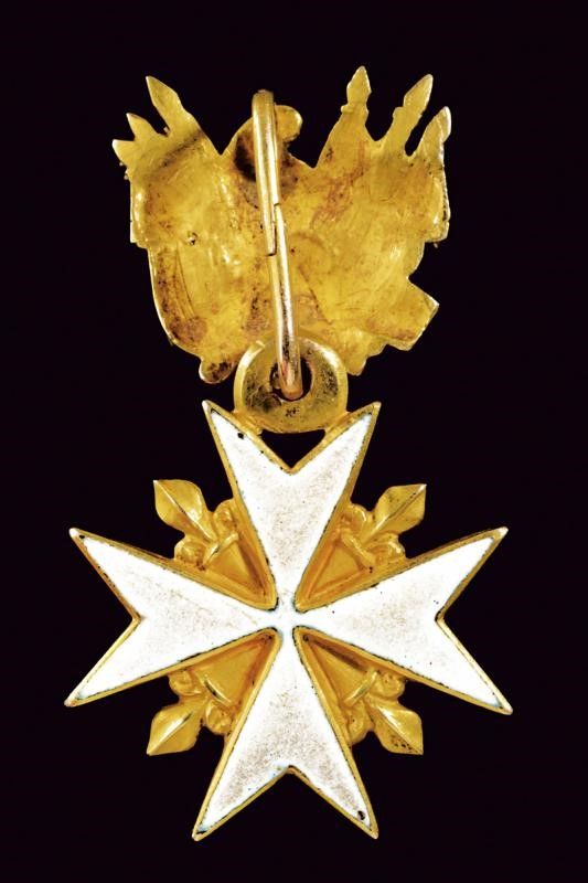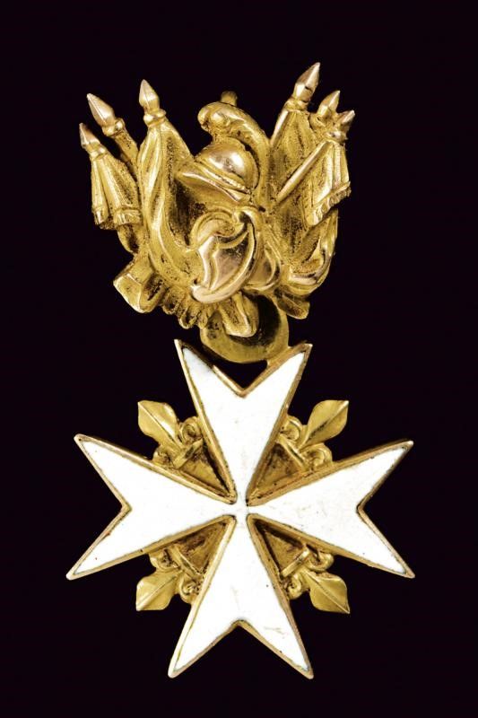 Prima metà del XVIII Secolo Bellissimo pendente da collo (riduzione) in oro con croce in smalto bianco (vari chips), sotto trofeo militare. Molto raro. 16 gr.