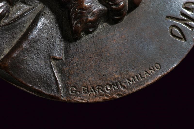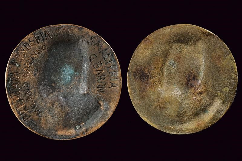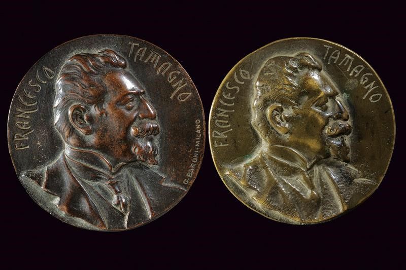 Regno d'Italia, diametro 6.5 - 7.3 cm. inizio del XX Sec. Lotto di due placchette in bronzo di forma circolare, al dritto bassorilievo del tenore, nella parte alta iscrizione 'FRANCESCO TAMAGNO'; in una sola placca opus 'G. BARONI - MILANO'. Entrambe lisce al rovescio, una marcata 'PREMIATA FONDERIA MILANO SARON