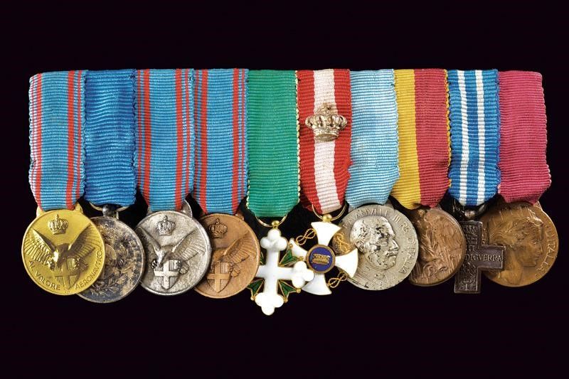 Regno d'Italia, lunghezza 10.4 cm. Secondo quarto del XX Secolo Barretta con dieci miniature appartenuta al tenete colonnello Amedeo Paradisi. Tre medaglie al valor aeronautico e un'altra medaglia militare areonautica; una al valor militare in argento; croce da cavaliere dei SS. Maurizio e Lazzaro; croce da ufficiale