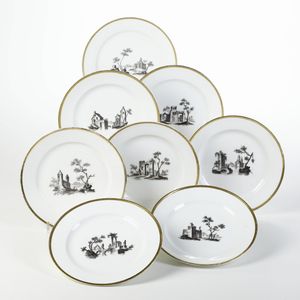 Otto piatti con paesaggi dipinti in monocromo, primi decenni del XIX secolo.