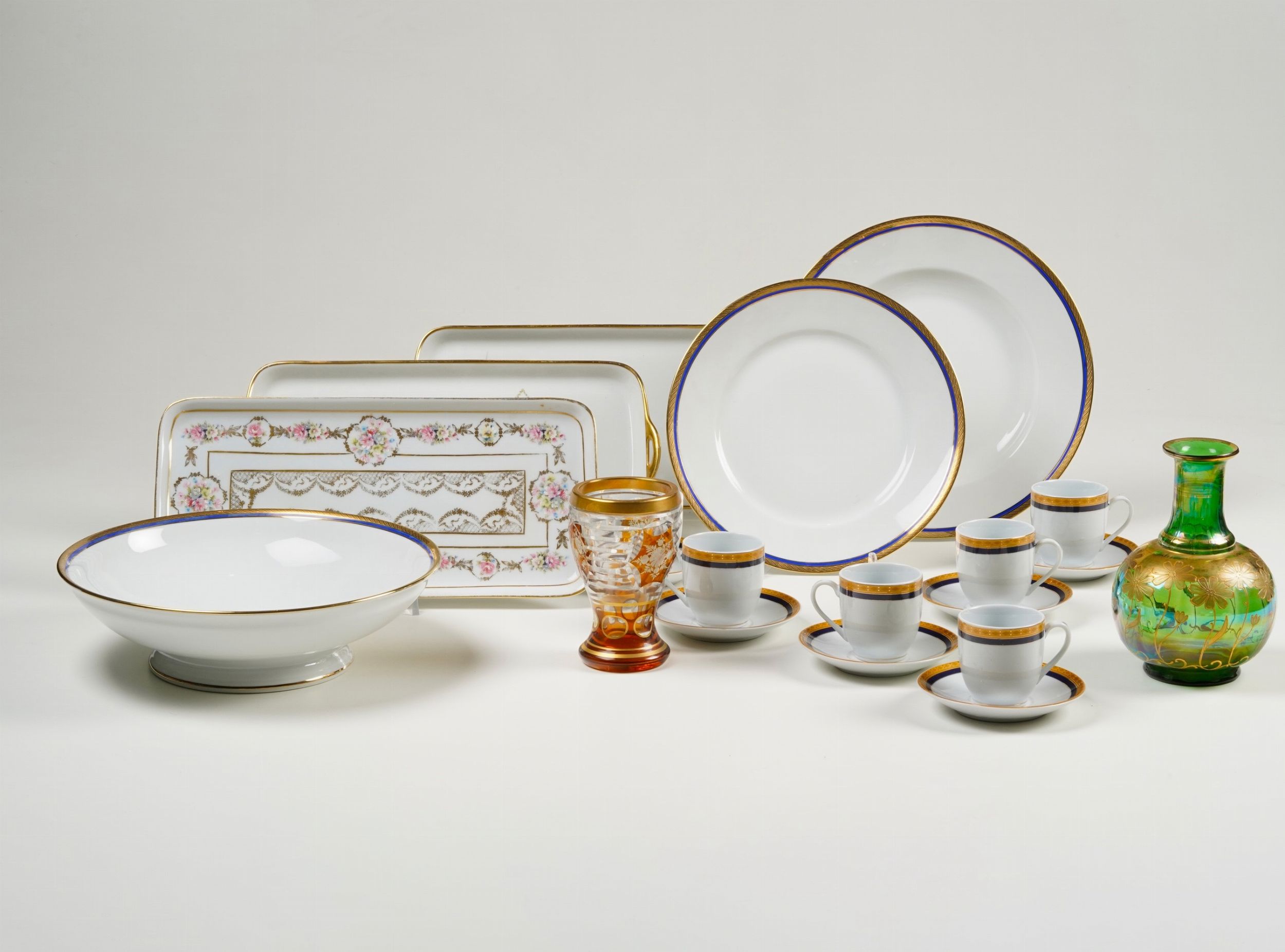 Parte di un servizio, ceramiche e vetri diversi, XX secolo.