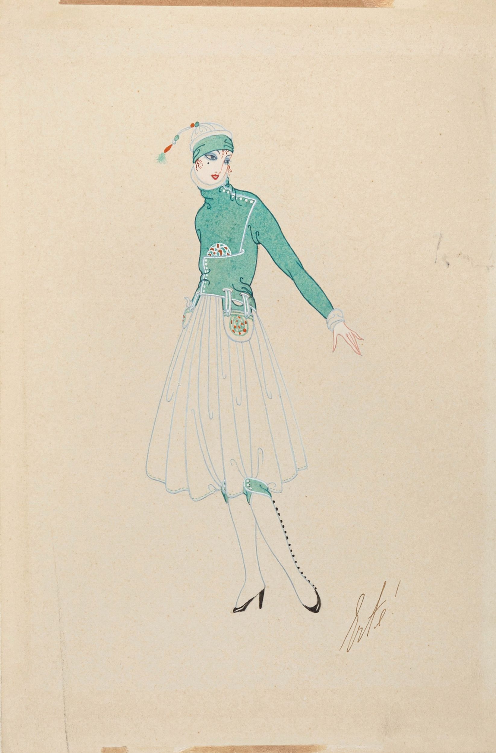anni 10 Disegno originale realizzato da Erté durante gli anni '10 per un costume teatrale. Recante al retro il timbro dell'artista e il numero d'archivio 68. Firmato.