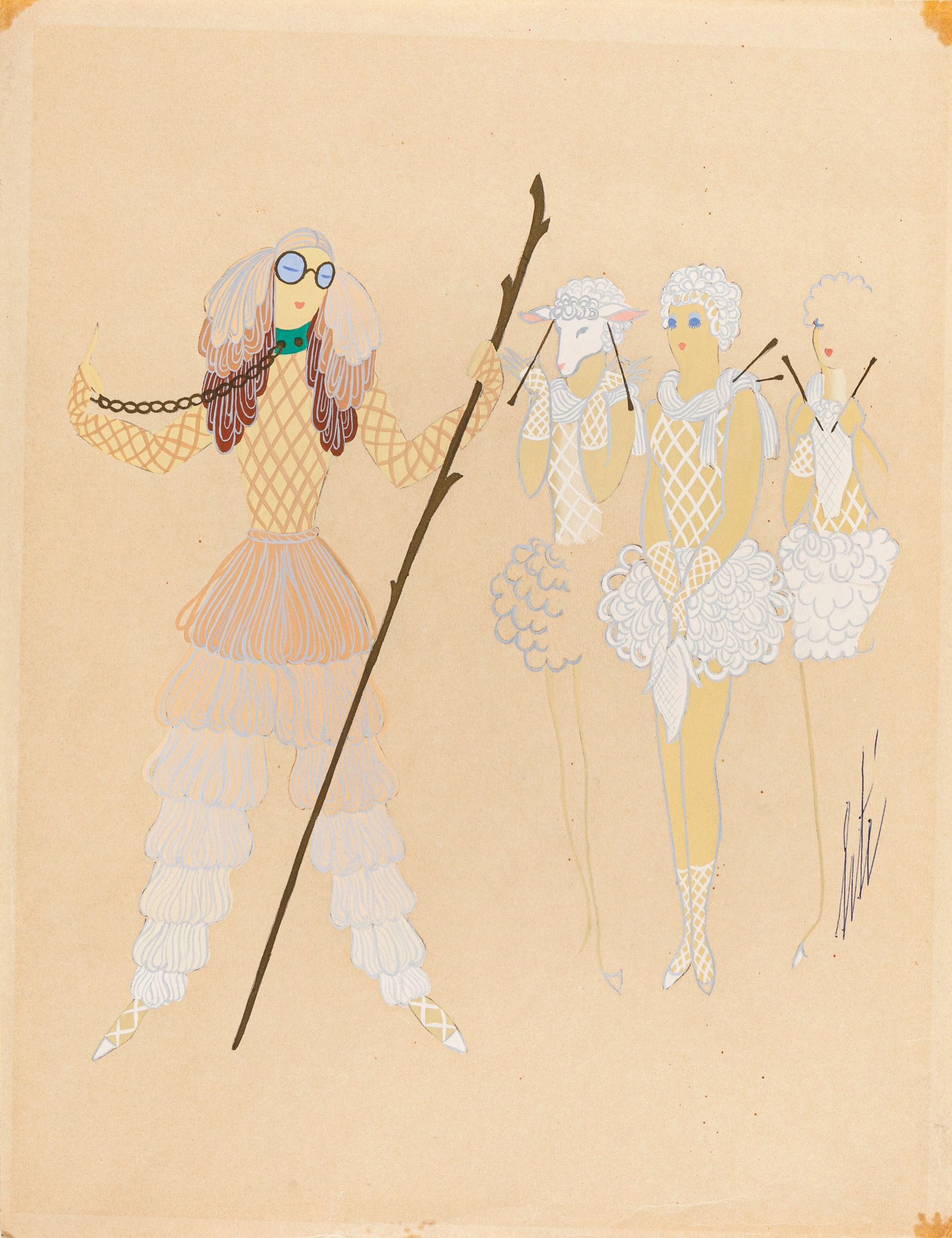 1939 Disegno originale realizzato da Erté nel 1939 per i costumi di una rappresentazione teatrale. Recante al retro il numero d'archivio 4548. Firmato.
