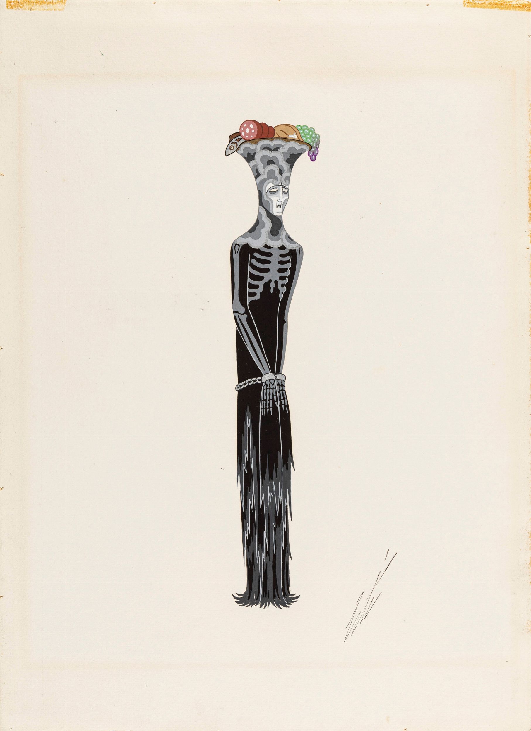1928 Disegno originale realizzato da Erté nel 1928 per i costumi di una rappresentazione teatrale tenutasi presso il Théâtre du Châtelet di Parigi. Recante al retro il titolo, timbro dell'artista e il numero d'archivio 1444. Firmato.