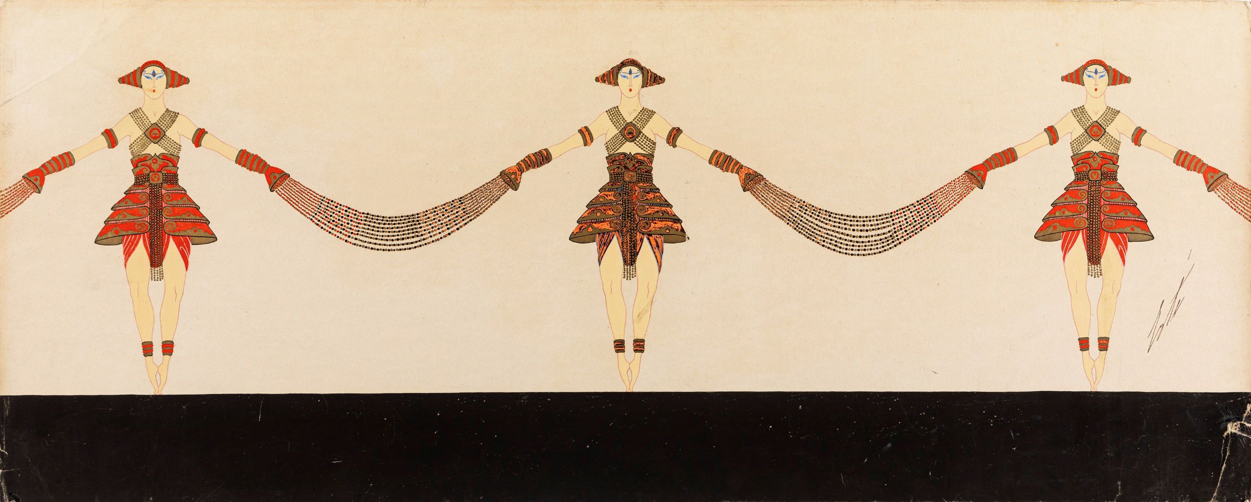 1922 Disegno originale realizzato da Erté nel 1922 per i costumi della rappresentazione teatrale 'Les Trésors de l'Indo-Chine', andata in scena nel celebre teatro Alcazar di Marsiglia nel 1922. Recante al retro il titolo e il timbro dell'artista. Pieghe agli angoli. Firmato.