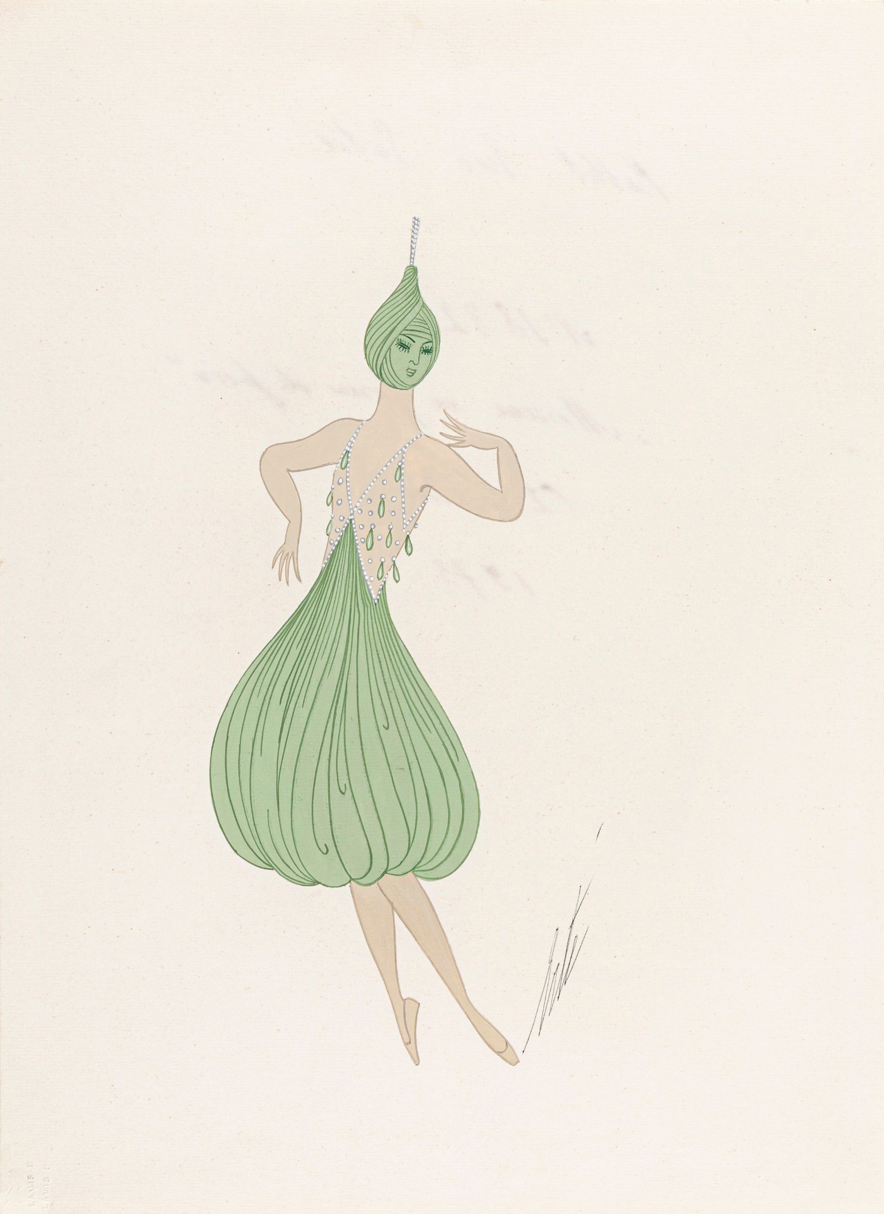 1973 Disegno originale realizzato da Erté nel 1973 per i costumi della rappresentazione teatrale 'Trois morceaux en forme de poire' di Erik Satie. Recante al retro il titolo, il timbro dell'artista e il numero d'archivio 18322. Firmato.