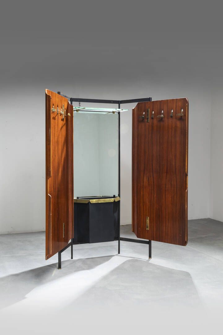 Appendiabiti con struttura in metallo verniciato e specchio ante in compensato. Fine anni '50 cm 187x147x35