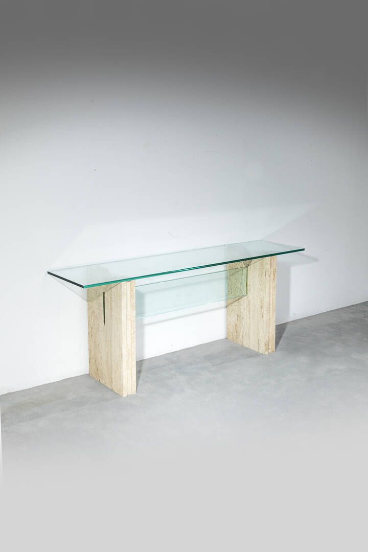 Struttura in travertino ottone e vetro. Anni '70 cm 70x170x43 Piccole sbeccature