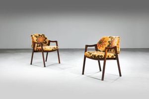 Coppia di poltrone con imbottitura rivestita in tessuto a fiori piedi in ottone. Anni '50 cm 74x76x70 Difetti