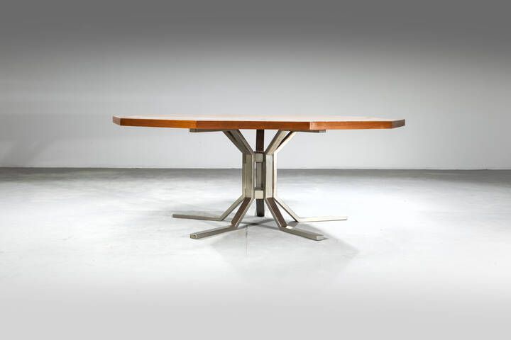 Grande tavolo con struttura in metallo satinato e piano impiallacciato in legno. Anni '60 cm 78x202x202 Difetti
