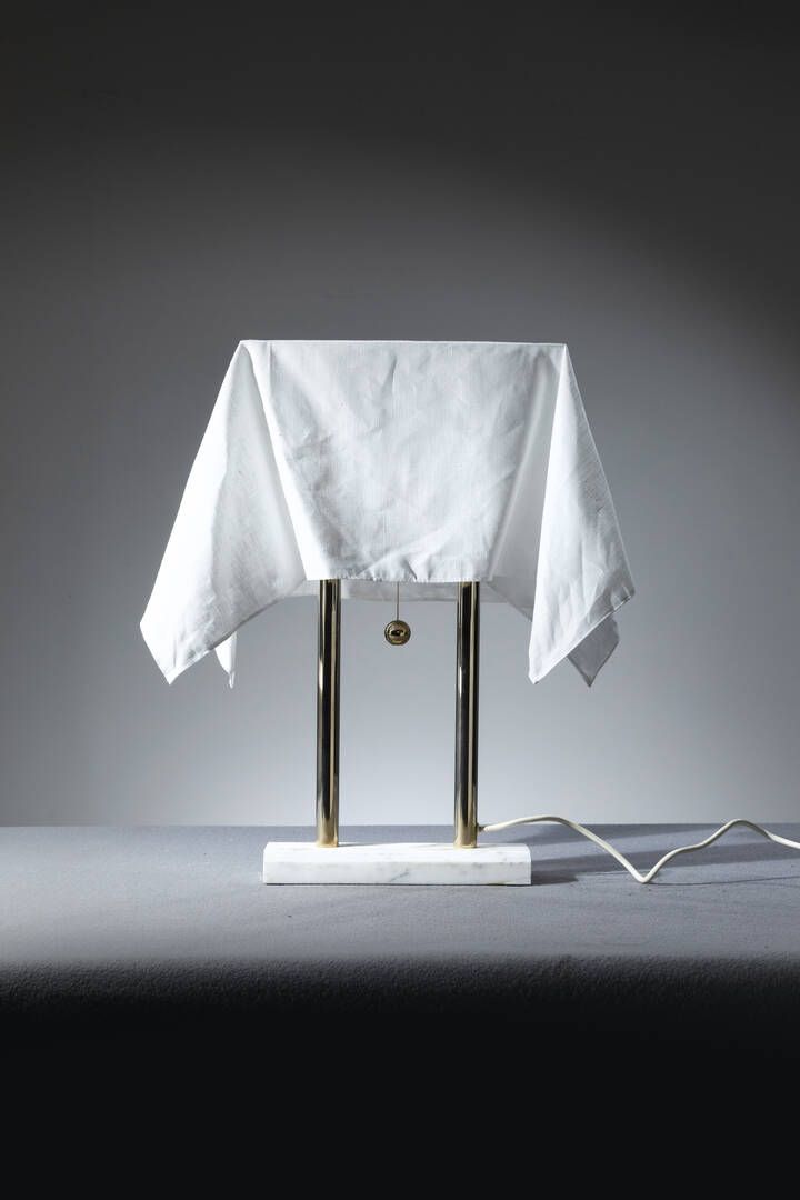 Struttura in ottone diffusore in tessuto. Base marmo Prod. Sirrah anni '80 h cm 51x30x13 Restauri sul marmo difetti