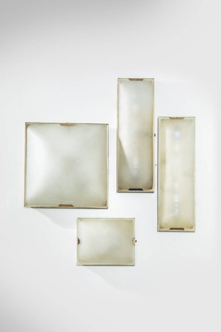 Struttura in metallo verniciato vetro sabbiato effetto ghiaccio e particolari in ottone. Anni '50 h cm 9x35x35 due da h cm 9x48x15 h cm 9x24x19 5