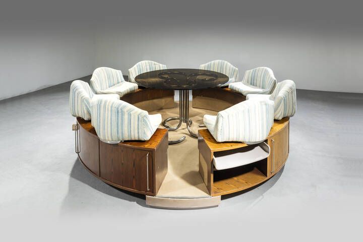 Struttura in legno imbottitura rivestita in tessuto piano in vetro fumè particolari in acciaio. Anni '70 cm 90x262 tavolo cm 73x120 Difetti