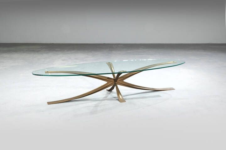 Struttura in ottone piano in cristallo ovale. Anni '60 cm 34x175x54 Sbeccatura del piano