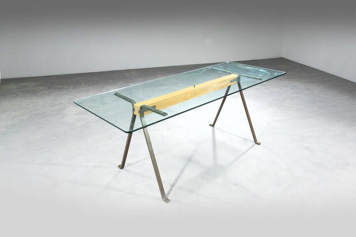 Struttura in metallo legno e paino in vetro. Prod. Driade anni '60 cm 71x200x77 Sbeccatura del piano