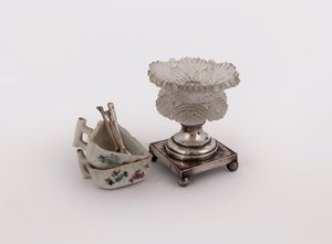 cm 8,5x7,5 e cm 2,5x6,5x5 (la coppia) una in metallo argentato con vaschetta in cristallo intagliato e due in [..]
