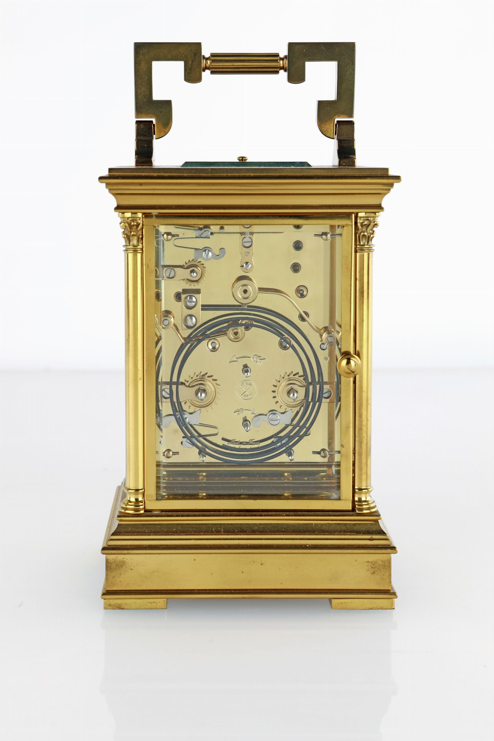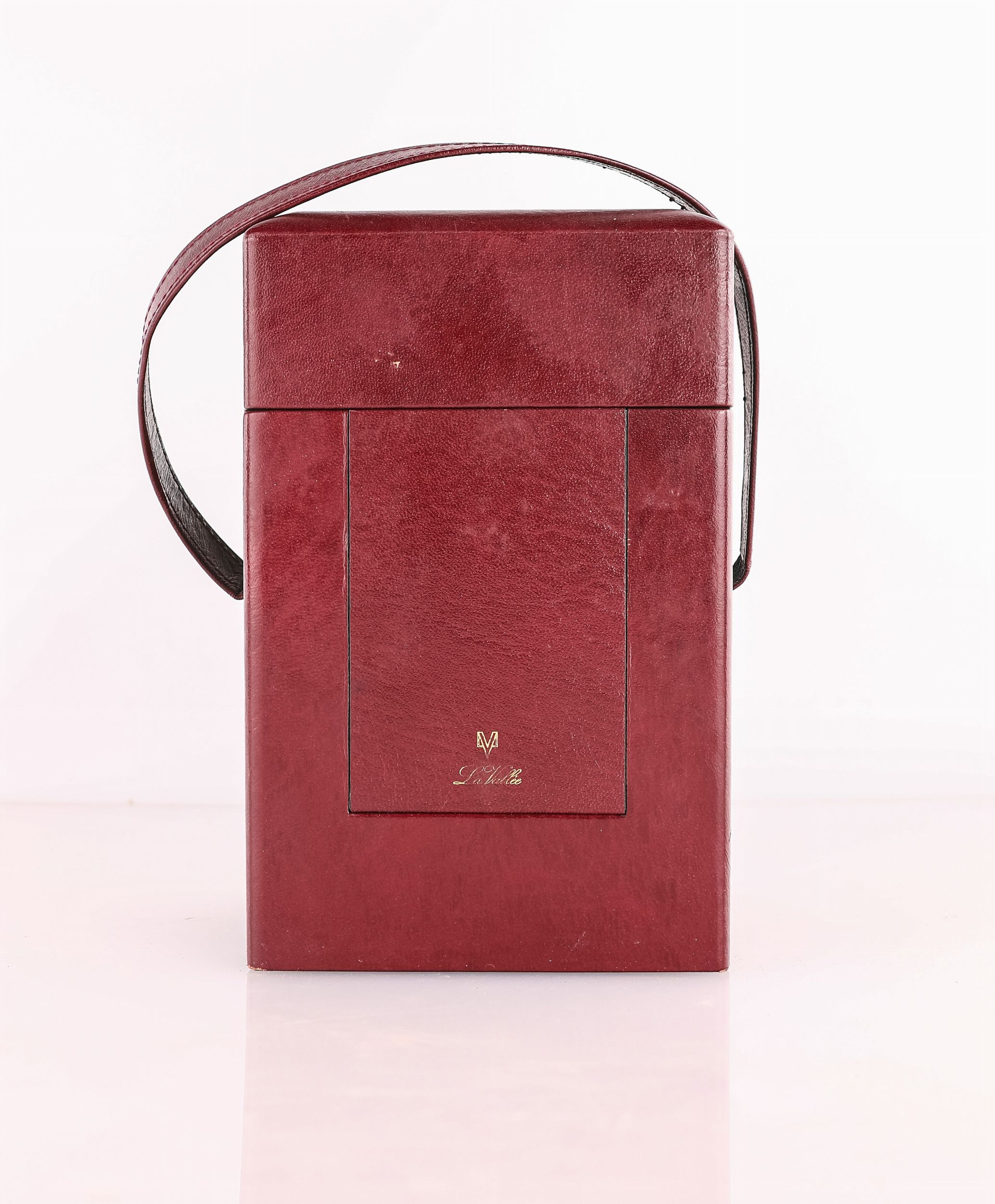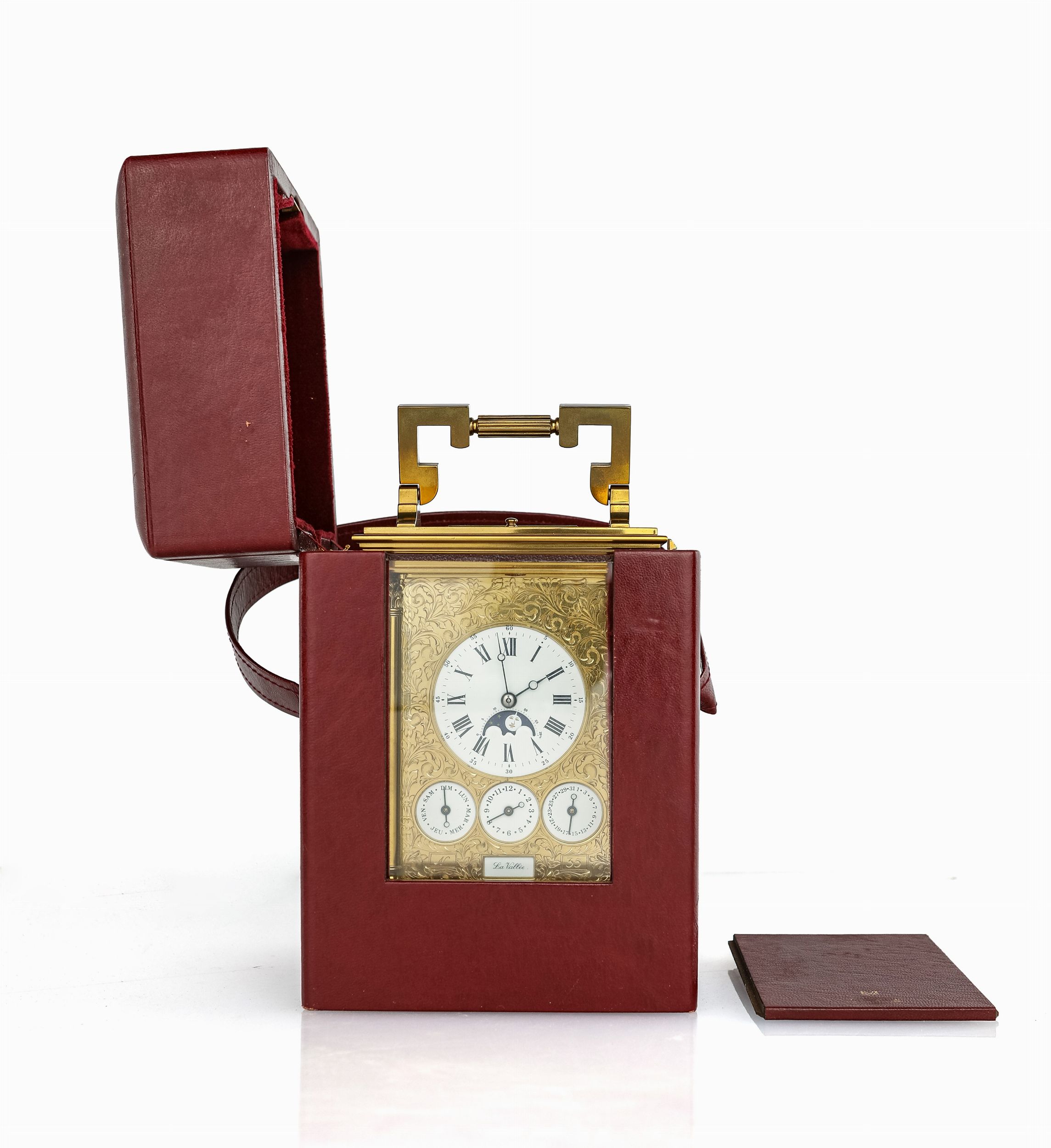 cm 22,5x11,7x10,2 - la custodia cm 23x14,5x13,5 cassa squadrata in ottone dorato e cristalli molati, quadrante in porcellana con calendario completo, sveglia e fasi lunari; movimento a carica manuale con suoneria ore e mezze ore, con chiave di carica. Entro scatola originale in cuoio rosso con istruzioni e garanzia