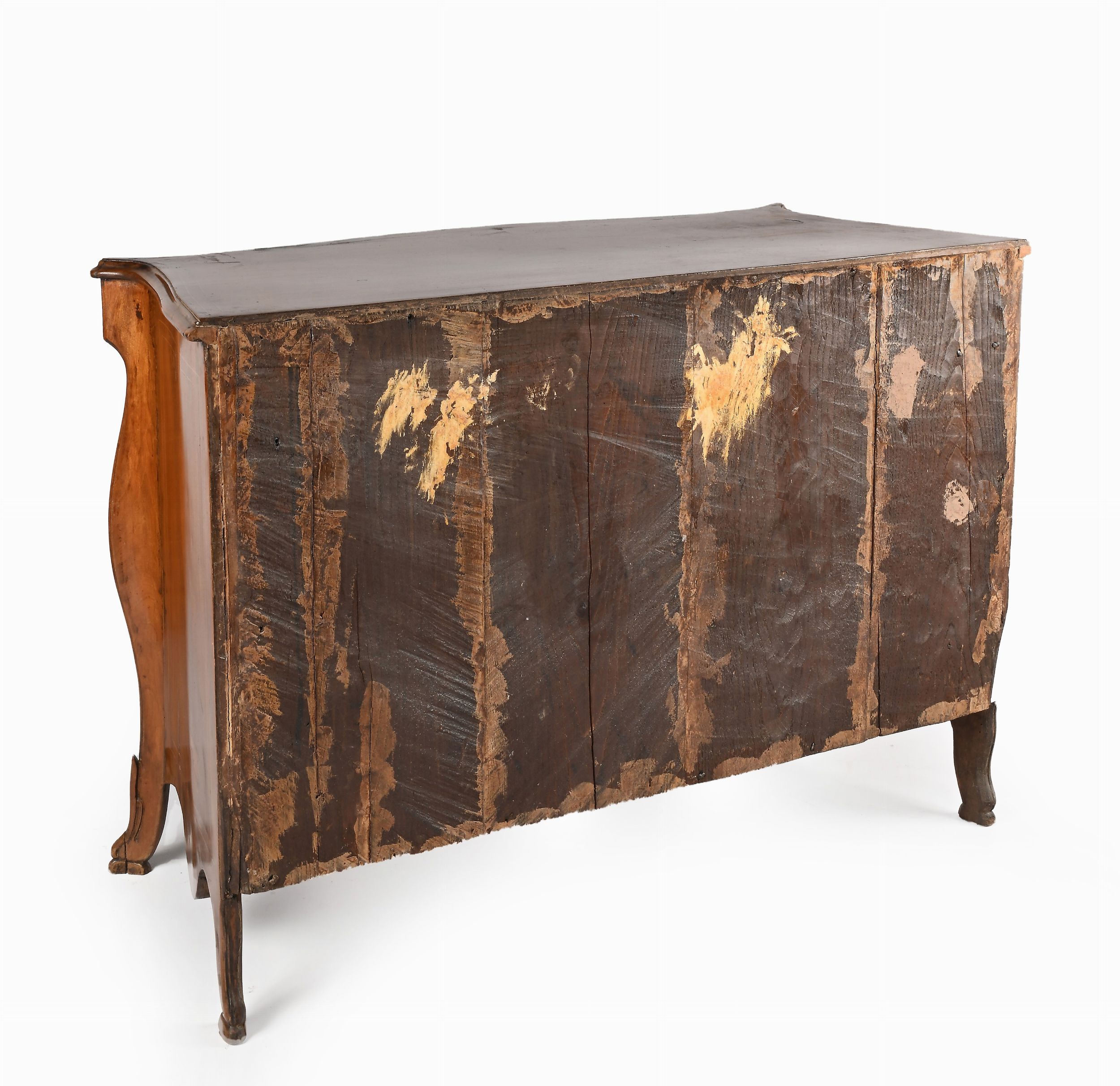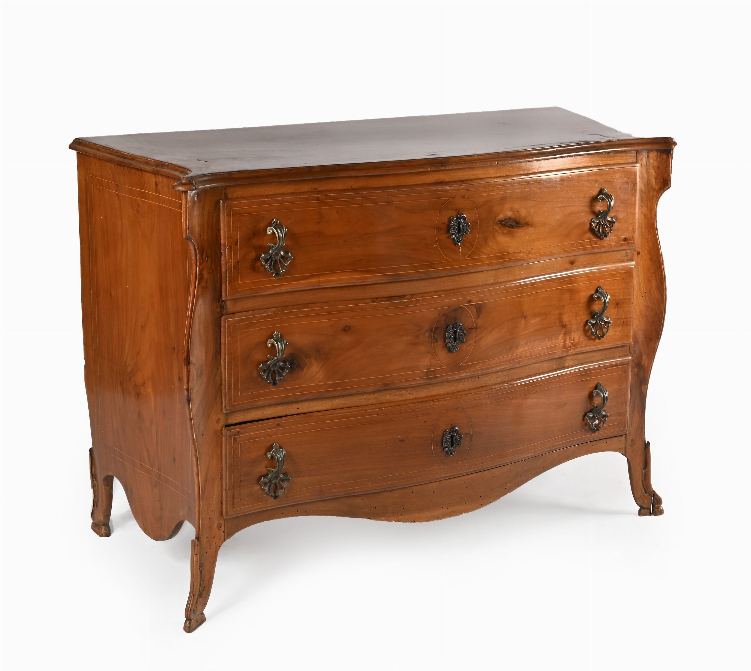 facciata lievemente convessa a tre cassetti con bocchette e maniglie in bronzo, spigoli curvilinei, piedi sfuggenti
