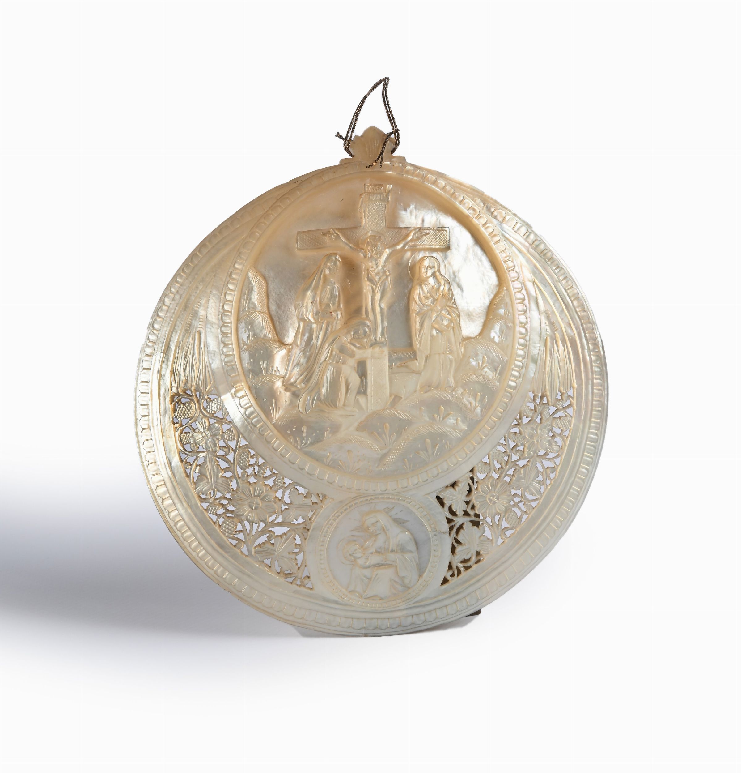 cm 15,5x14,8 raffigurante la crocefissione con la Vergine, San Giovanni e la Maddalena inginocchiata; in basso, entro medaglione circolare, Madonna col Bambino; tutt'intorno fiori traforati. Questa tipologia di conchiglie, realizzate a mano a Betlemme e a Gerusalemme come souvenir di lusso per i pellegrini, sono da sempre considerate un prezioso oggetto da collezione