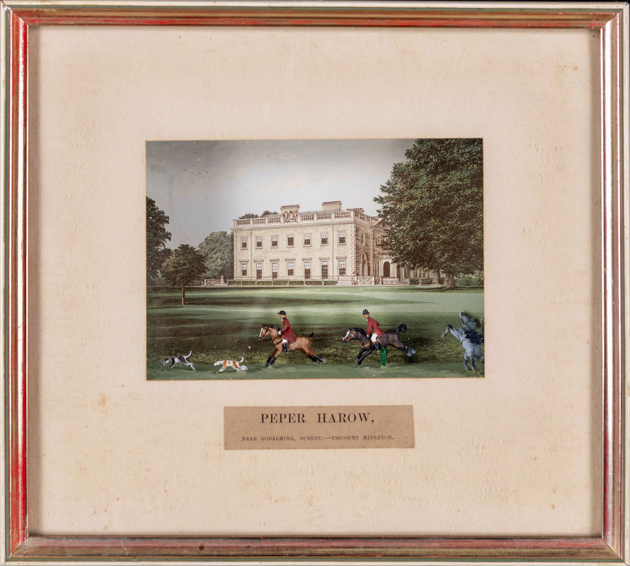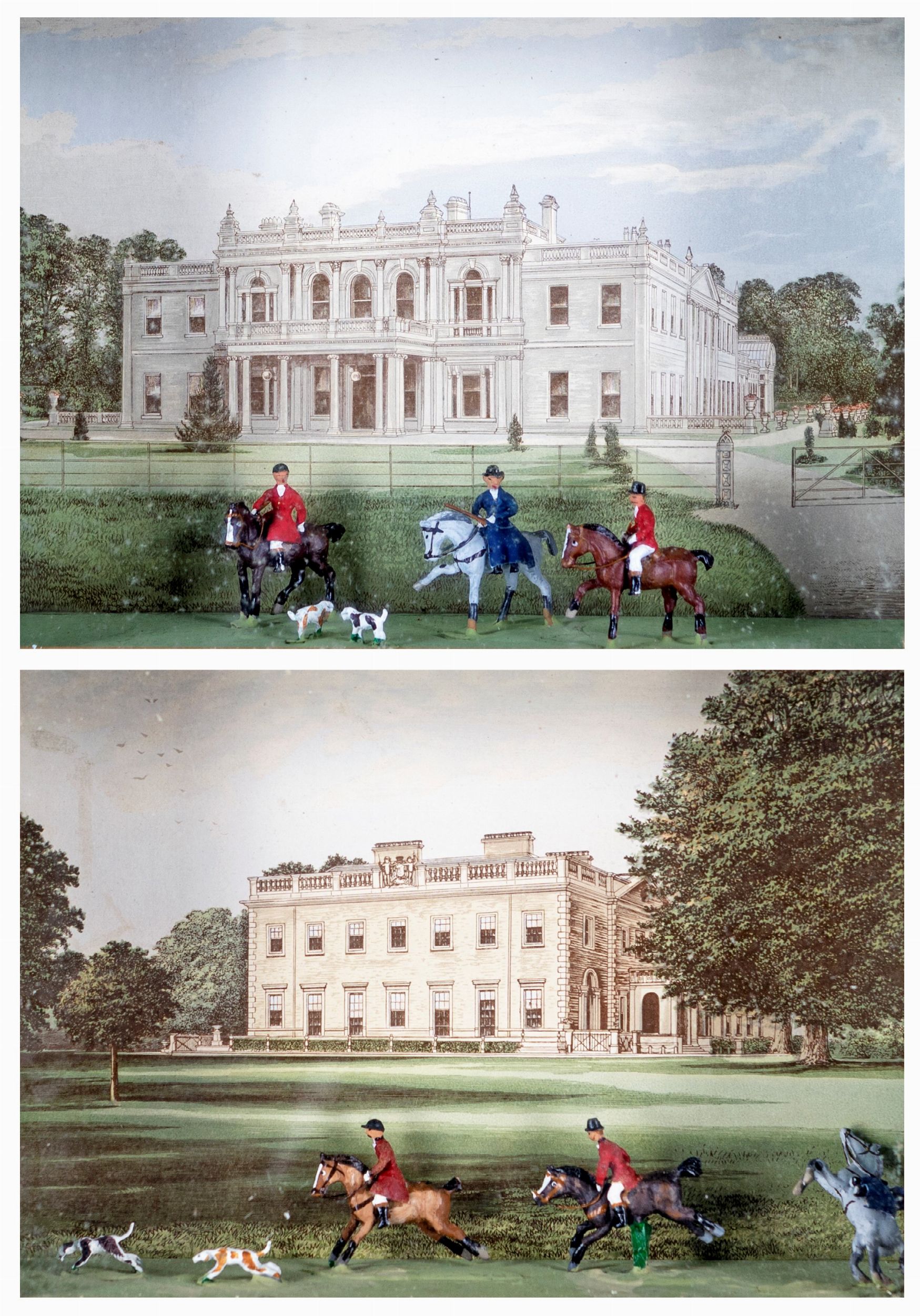 cm 27x30 raffiguranti battute di caccia alla volpe, ambientate rispettivamente nel parco della seicentesca Rolleston Hall nella contea dello Staffordshire e nel parco della settecentesca Peper Harow House nel Surrey. Al verso etichetta di 'Authentic models by Island Imports'