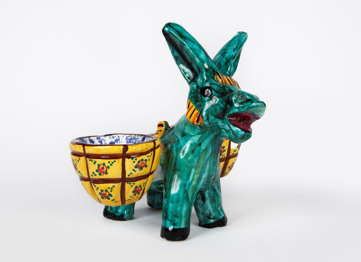 cm 19x19x17 raffigurante un asino con gerle. Firmato sotto una zampa MAS Deruta. Gli artigiani derutesi, ispirandosi alla saggezza e alla tenacia dell'asino, iniziarono a crearne in ceramica come regalo di buon auspicio, considerandolo portafortuna e simbolo di prosperità, e rappresenta un'icona radicata nella tradizione artigianale umbra così come l''Asinello Vietrese' e lo 'Sciccareddu' siciliano
