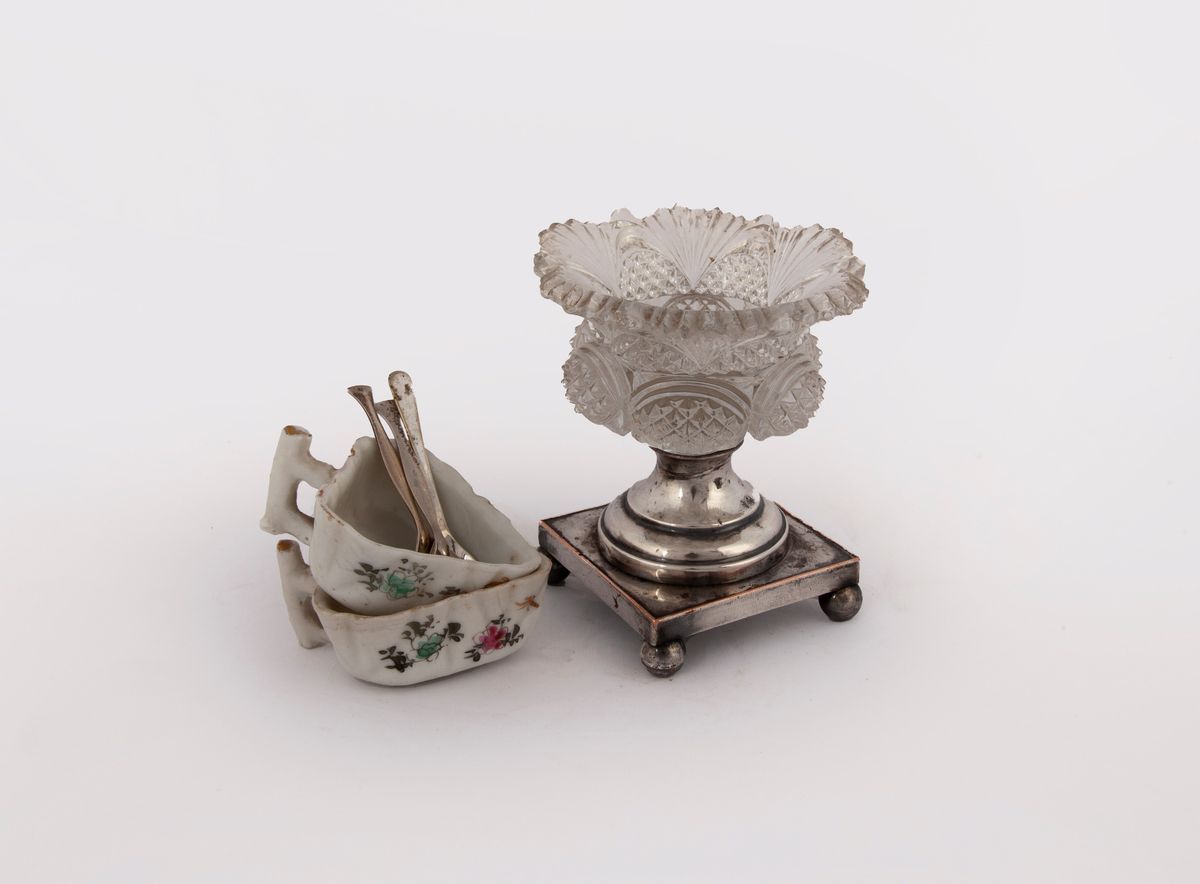 una in metallo argentato con vaschetta in cristallo intagliato e due in porcellana bianca di forma triangolare decorate a piccoli fiori; complete di cucchiaino