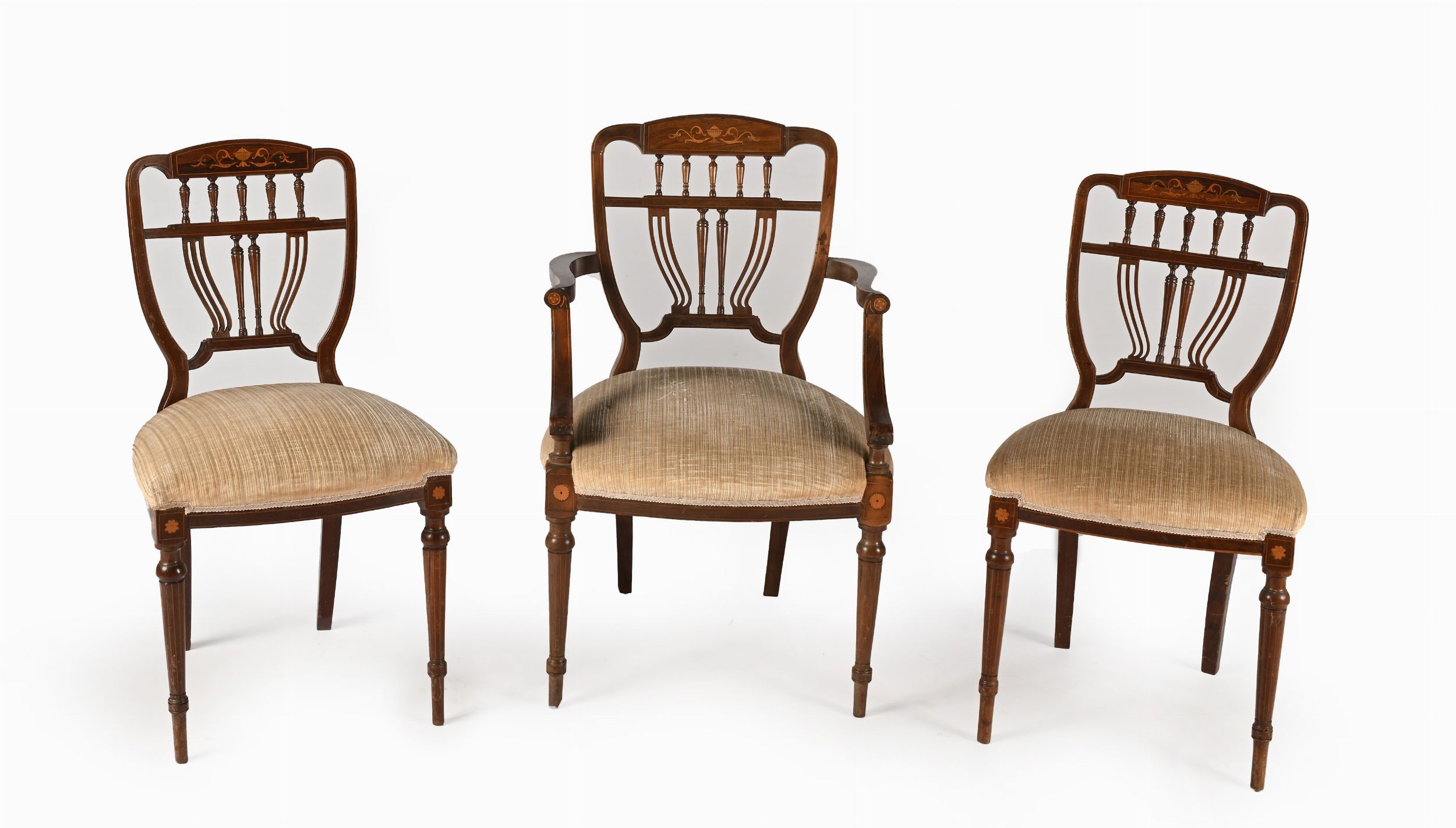 Poltroncina con balaustrini intarsiata e coppia di sedie en suite