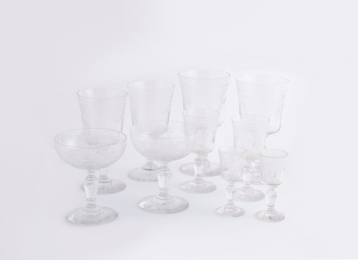 decorati da ghirlande e festoni incisi, composto da sessantadue elementi coś suddivisi: diciassette da acqua, tredici da vino, tredici da liquore, quindici da grappa e quattro coppe da champagne