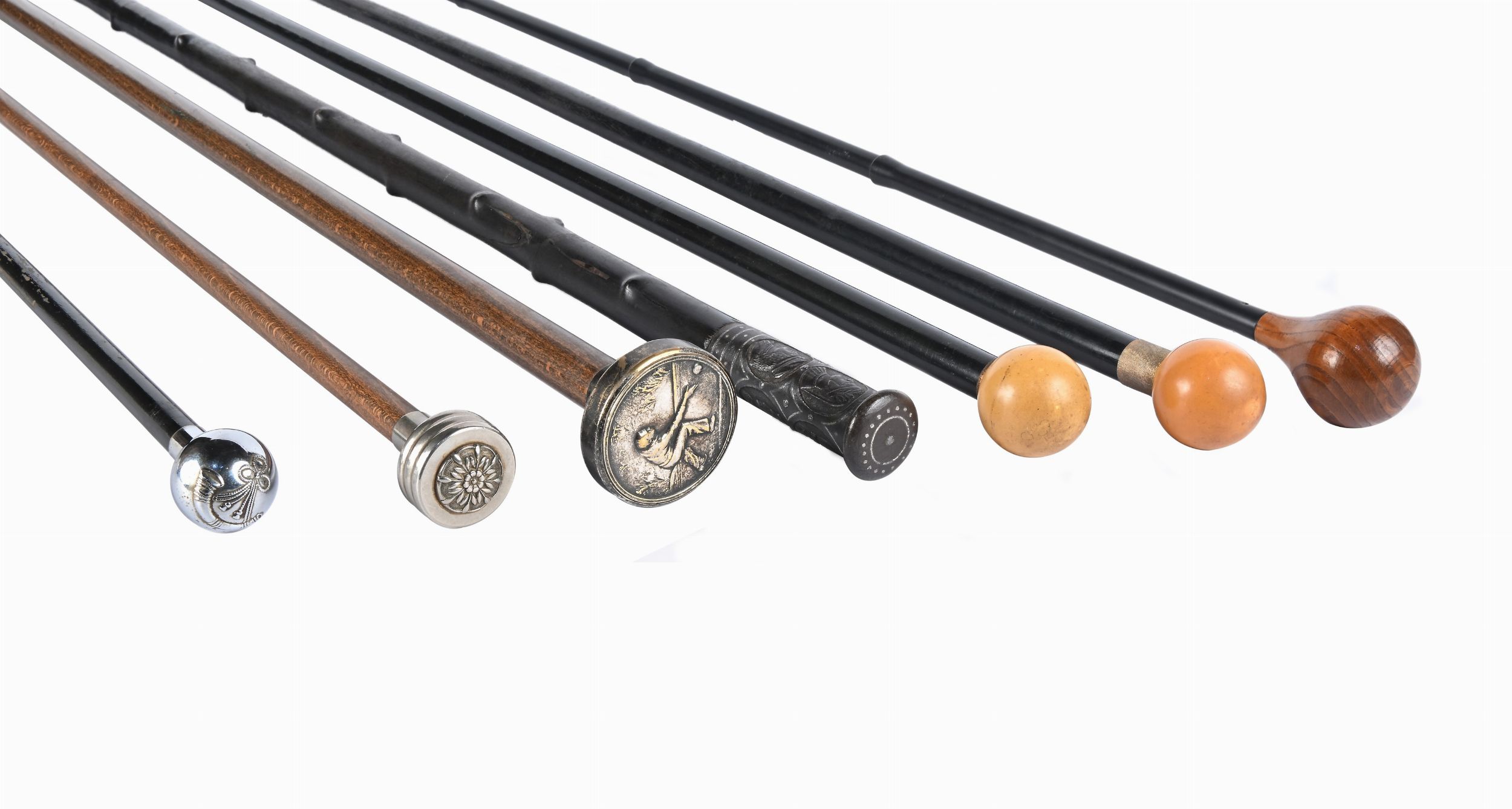 caratterizzati da pomolo a sfera in legno e in metallo argentato; uno pieghevole con canna in metallo