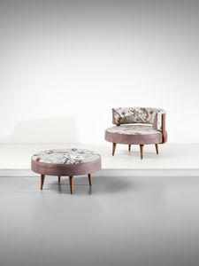 Seconda metà del XX secolo.Dimensioni: poltrona 66 x 93x 93 cm. poggiapiedi 40 x 80 x 80 cm