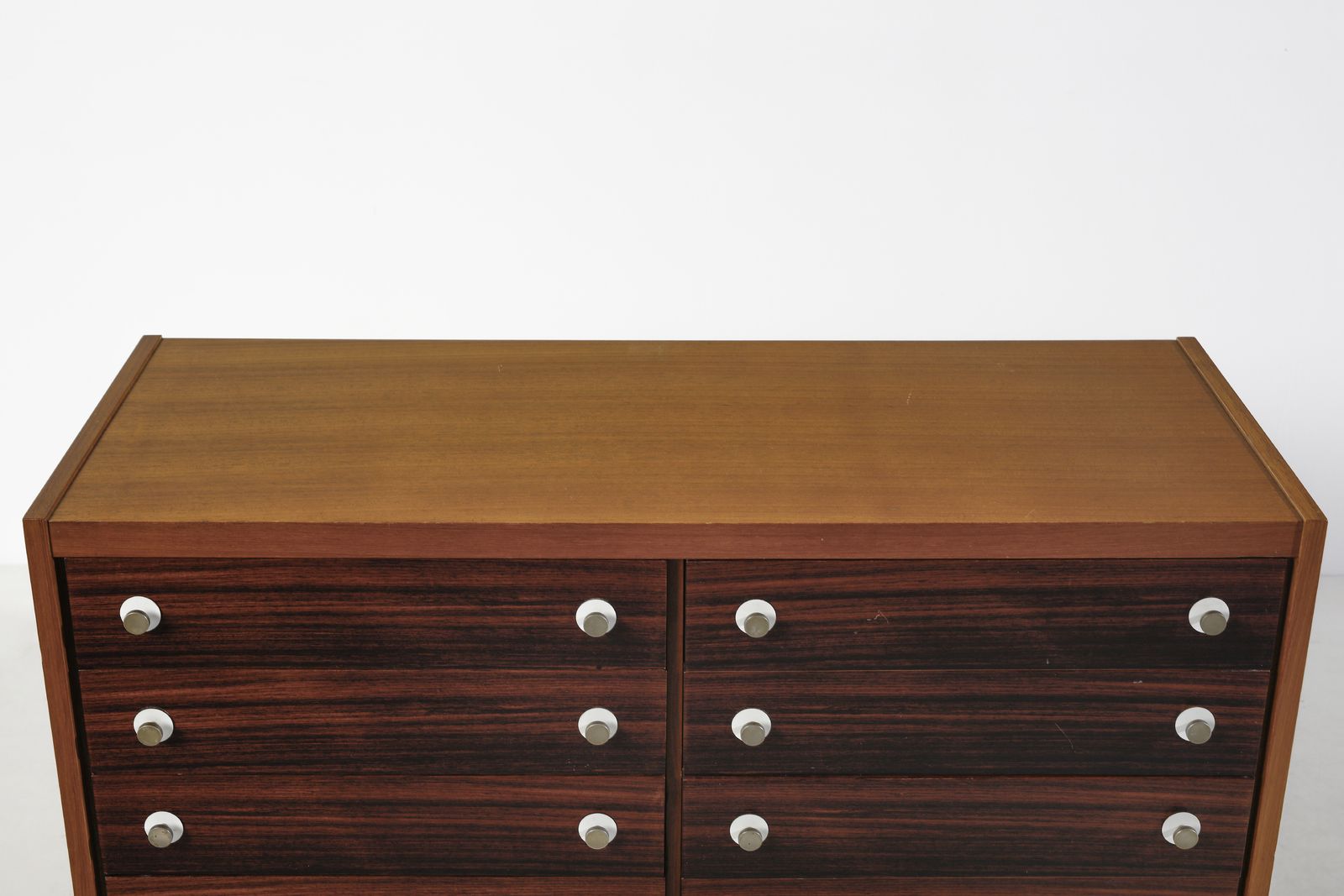 Dimensioni: cassettone 74,5 x 126 x 50 cm. specchio 130 x 60,5 x 13 cmBibliografia: Rivista dell'Arredamento n. 77, maggio 1961, pubblicità.
