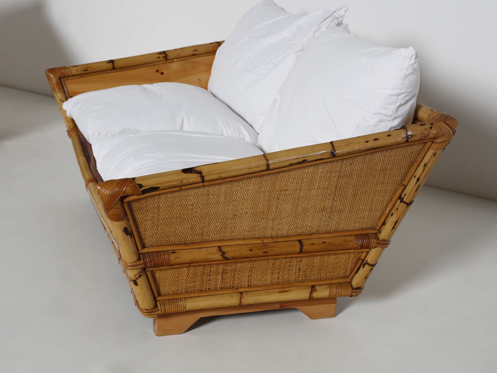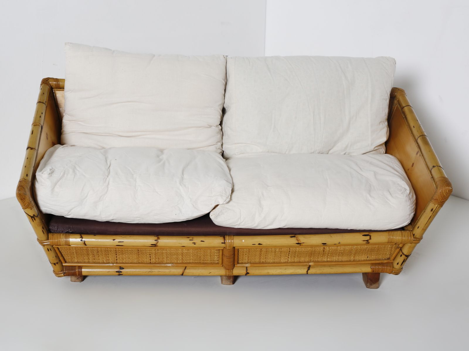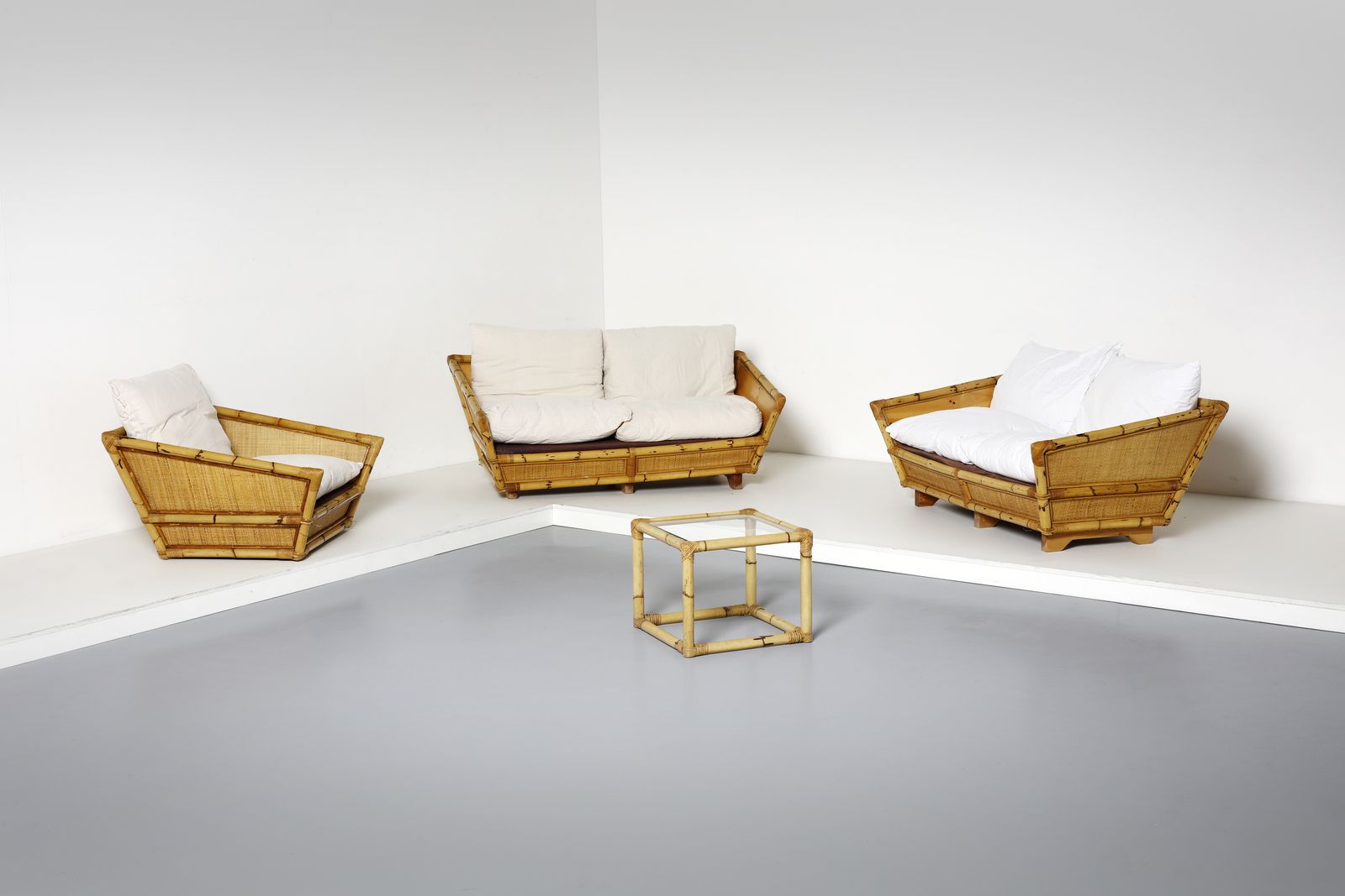 Anni Settanta.Dimensioni: divano 63 x 155 x 90 cm. poltrona 55 x 96 x 90 cm. tavolino 40 x 50 x 50 cm