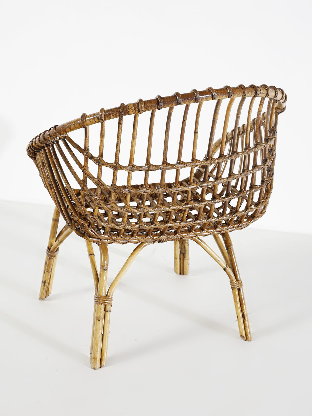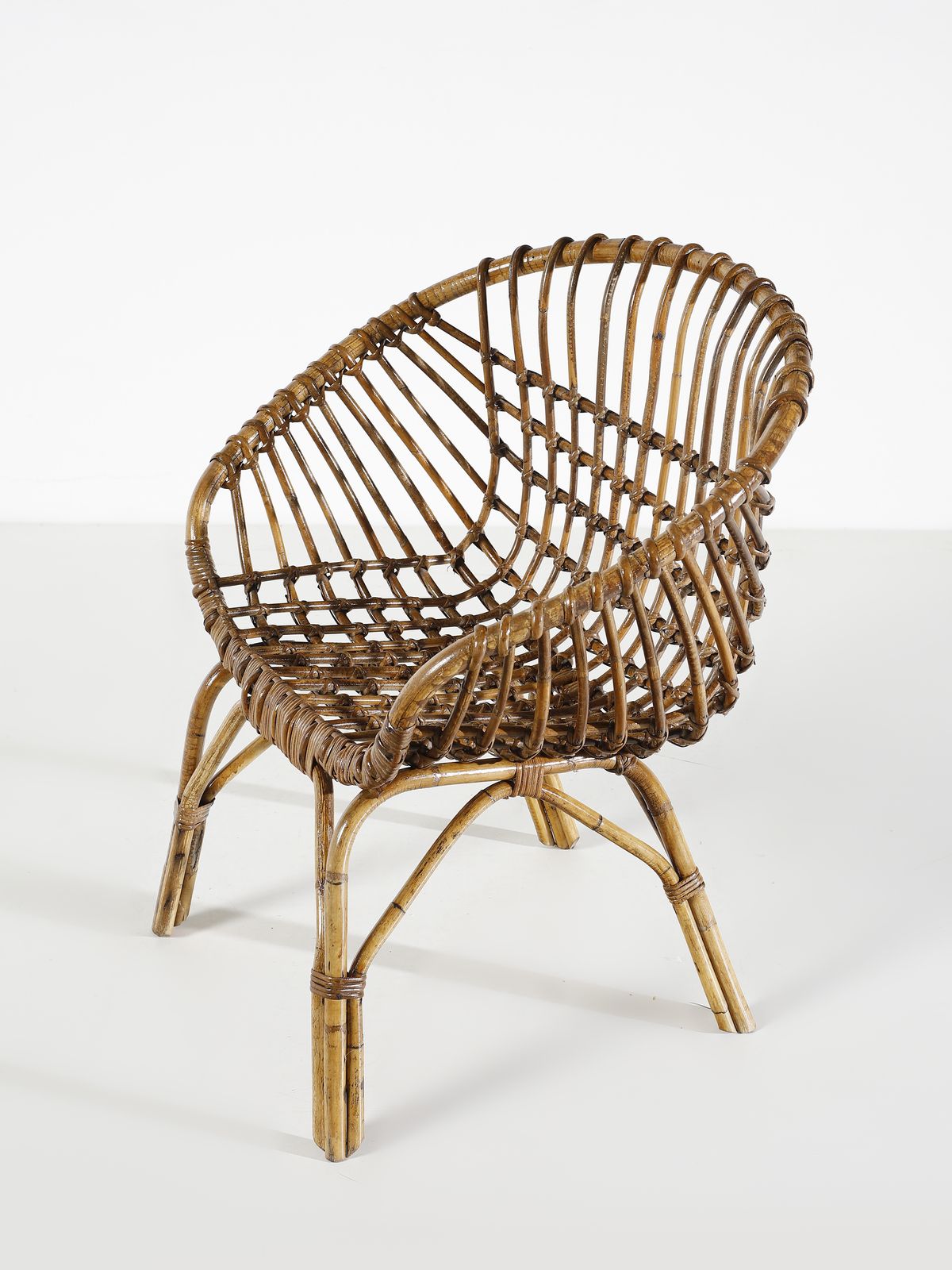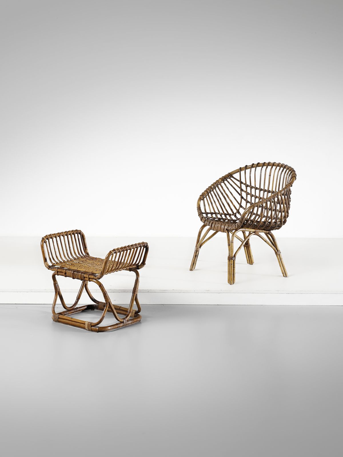 Anni Cinquanta / Sessanta.Dimensioni: poltrona 80 x 76 x 60 cm. poggiapiedi 53 x 59 x 39 cm