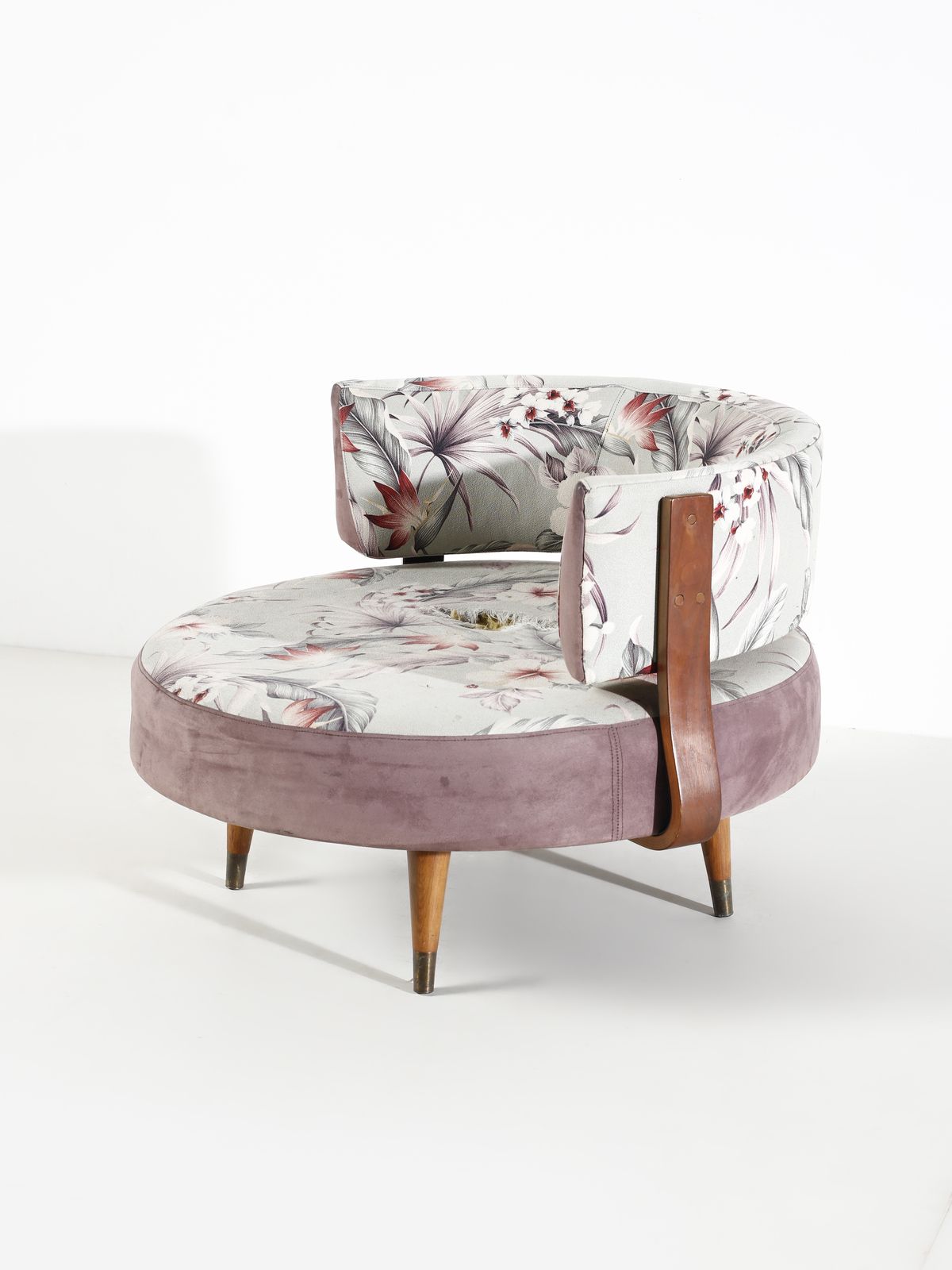 Seconda metà del XX secolo.Dimensioni: poltrona 66 x 93x 93 cm. poggiapiedi 40 x 80 x 80 cm