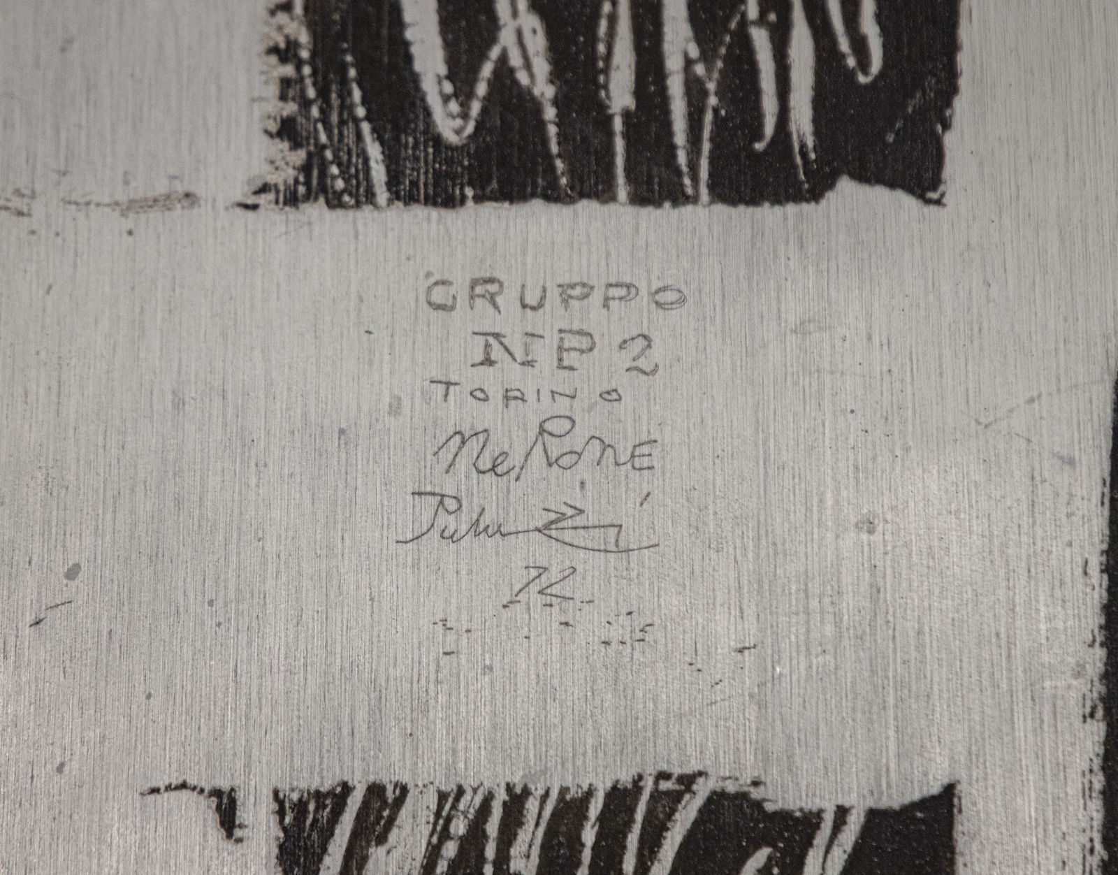 Firmato'GRUPPO NP2 TORINO NeRonE Patuzzi 72'.Costituito da una fascia inferiore di altezza 199 cm e una superiore di 19 cm. Larghezza dei pannelli che compongono il disegno in sequenza da sinistra a destra: 31,5 - 99 - 99 - 51 - 31,5 - 78 - 35 - 99 cmLotto accompagnato dal certificato di autenticità dell'Archivio Nerone Giovanni Ceccarelli, TorinoProvenienza: Collezione Fiorio, Genova