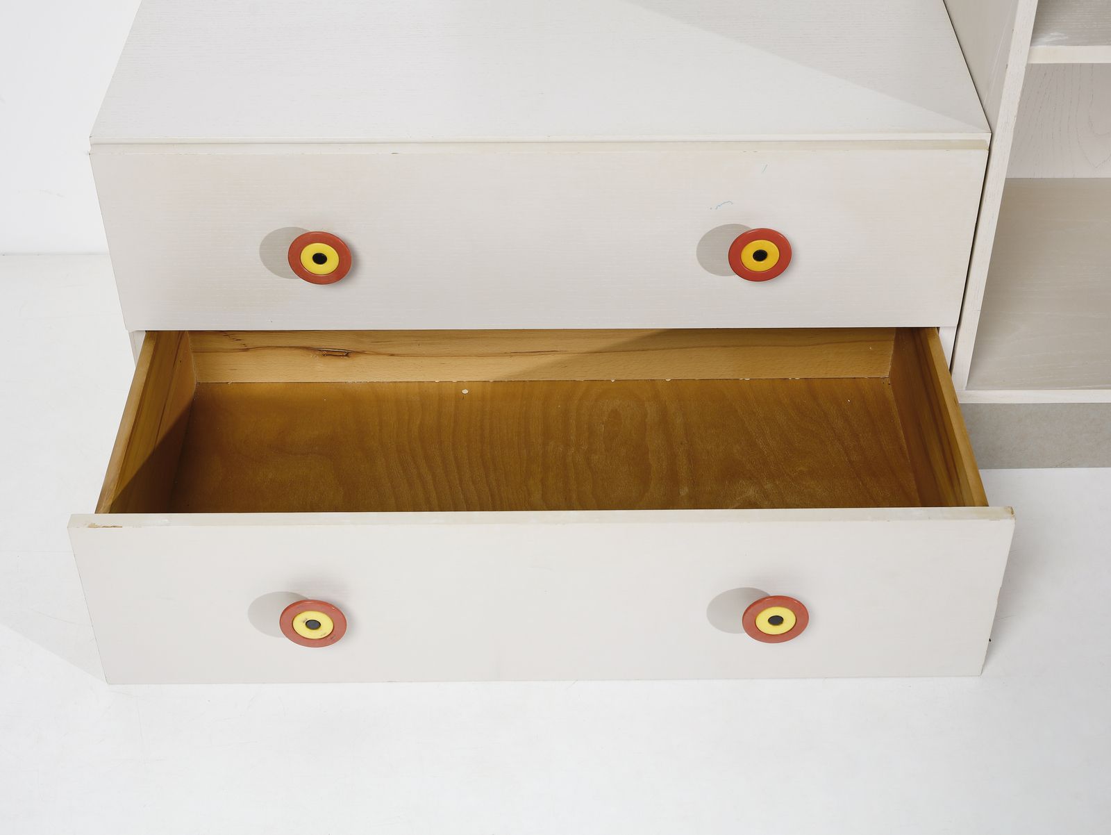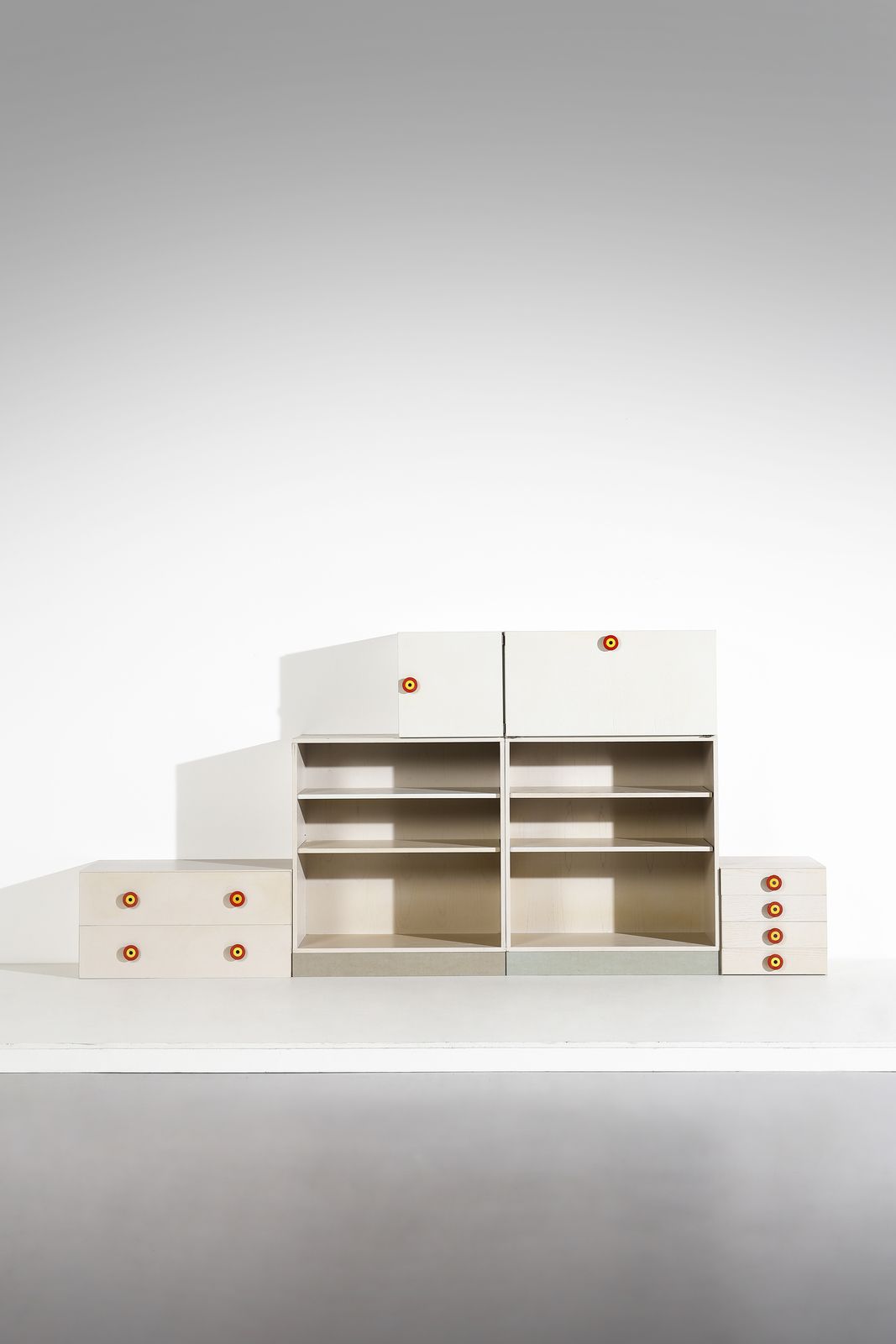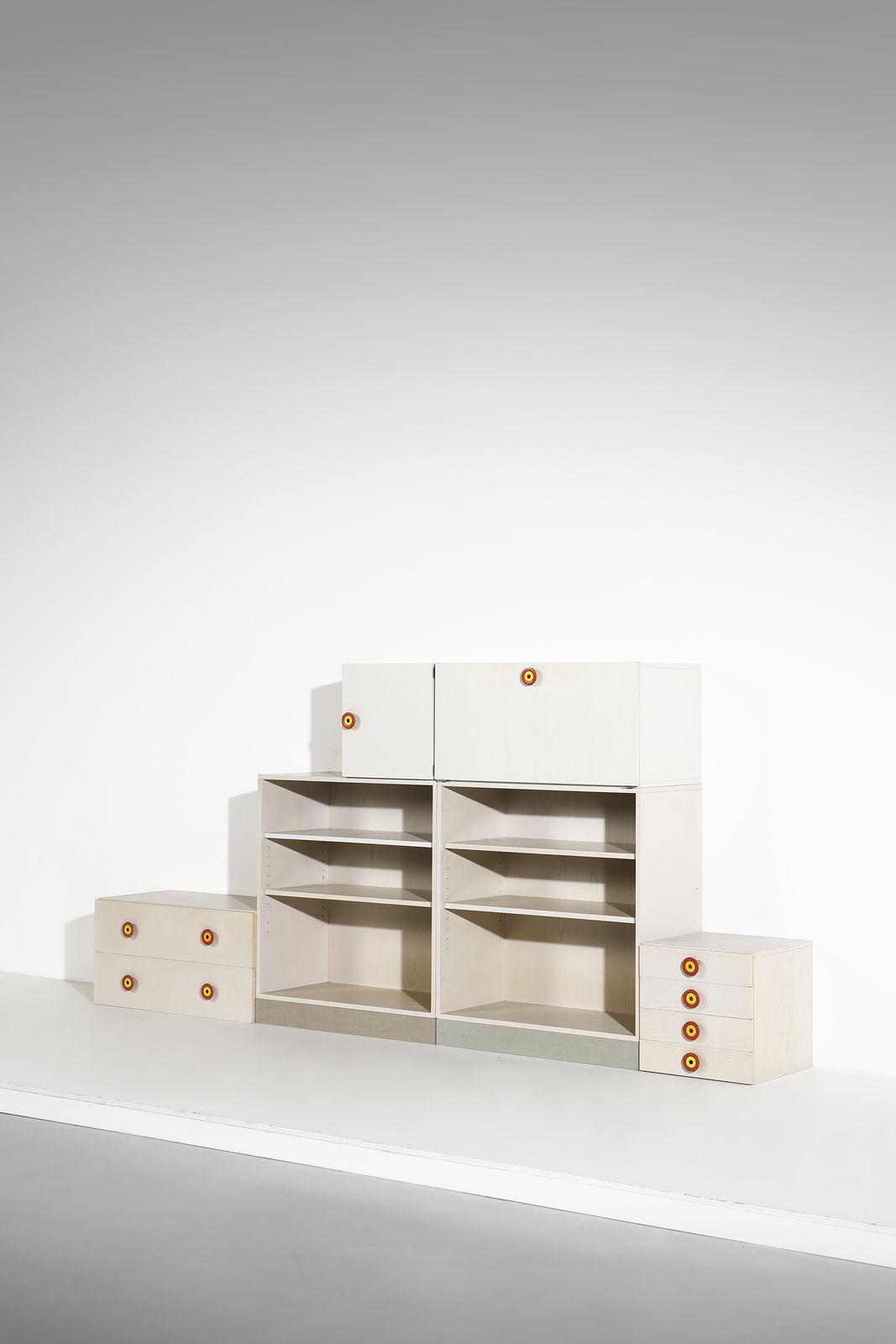 1967-1968.Cassettiera grande: 45 x 90 x 47 cm. cassettiera piccola: 45 x 45 x 47 cm. libreria: 100 x 90 x 45 cm. stipo ad anta: 45 x 44,5 x 47 cm. stipo a ribalta: 45 x 90 x 47 cmBibliografia: Ettore Sottsass, Mobili e qualche arredamento, Mondadori - Edizioni Philippe Daverio, Milano 1985, pp. 58-59. I. Mietton, Sottsass Poltronova 1958-1974, Skira 2021, pp.152-153, 138-139