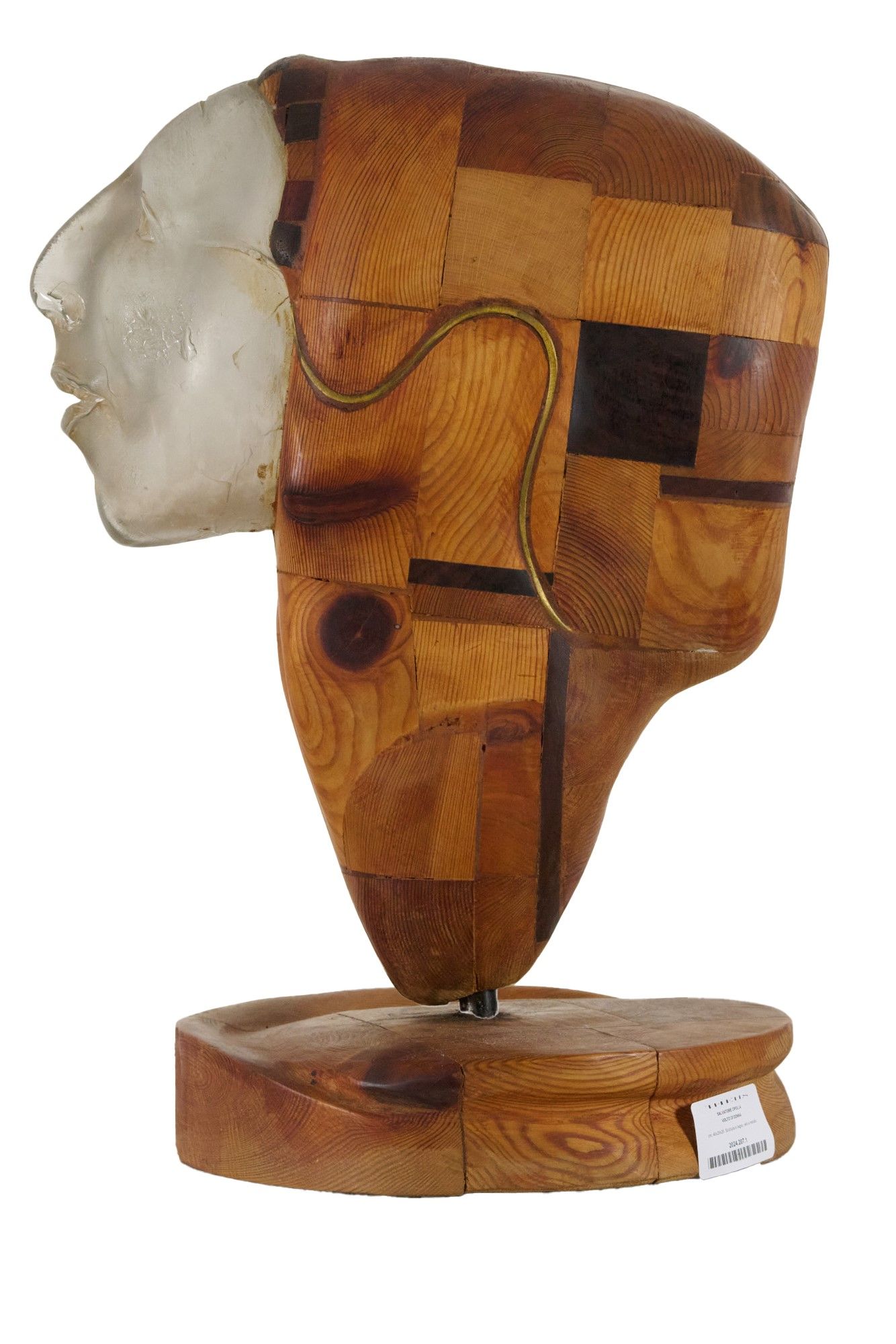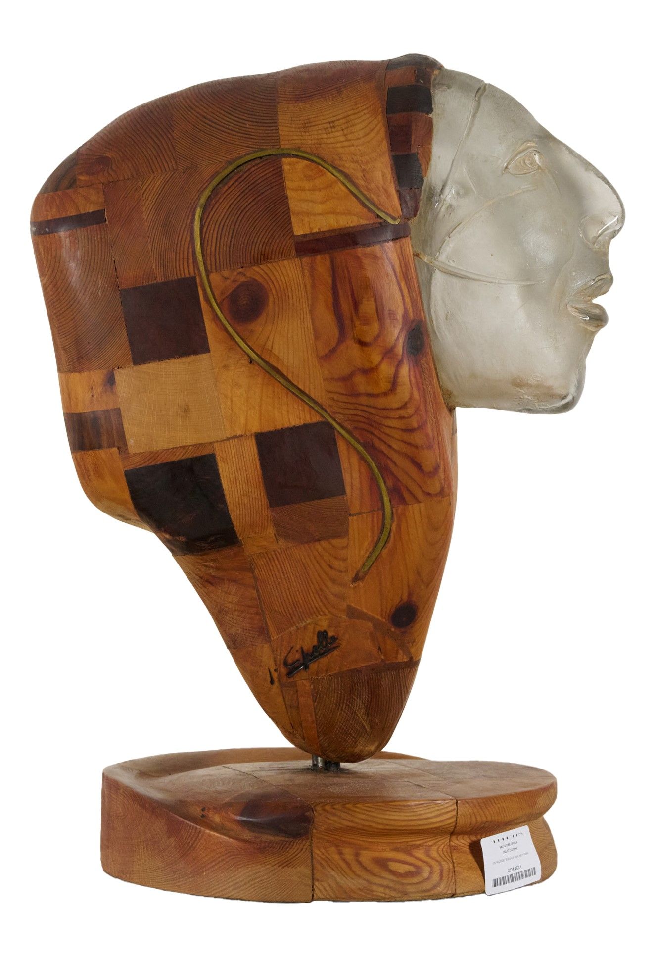 Scultura in legno, vetro e metallo, cm. 46x26x26